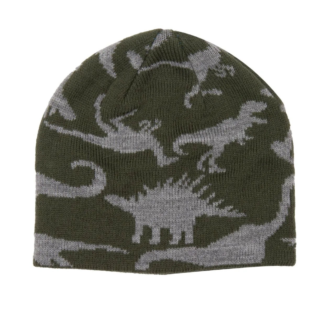 Modaiola cuffietta jacquard tricot verde con disegno jaquard dinosauri . Perfetto per stare al calduccio e nello stesso tempo essere alla moda.