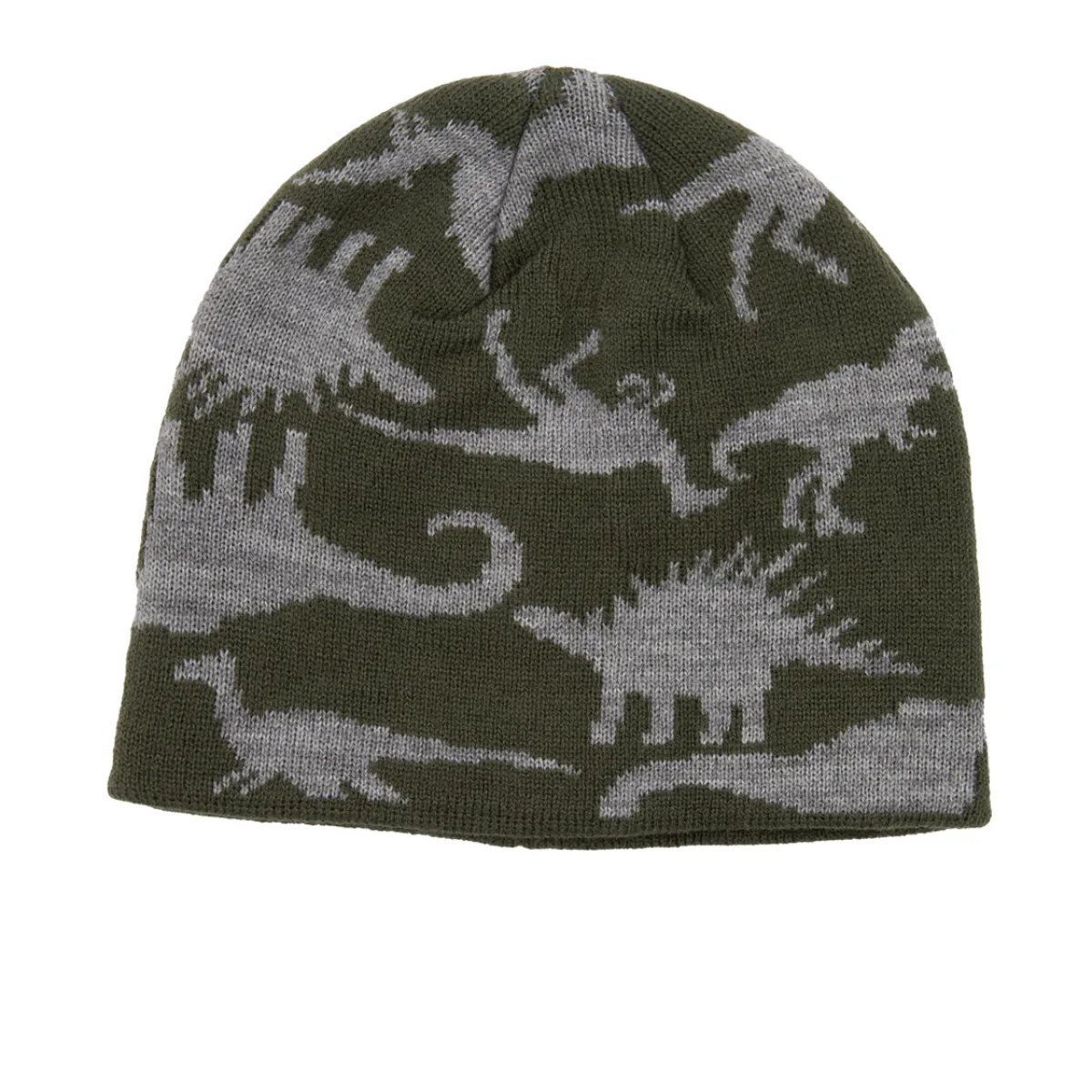 Modaiola cuffietta jacquard tricot verde con disegno jaquard dinosauri . Perfetto per stare al calduccio e nello stesso tempo essere alla moda.