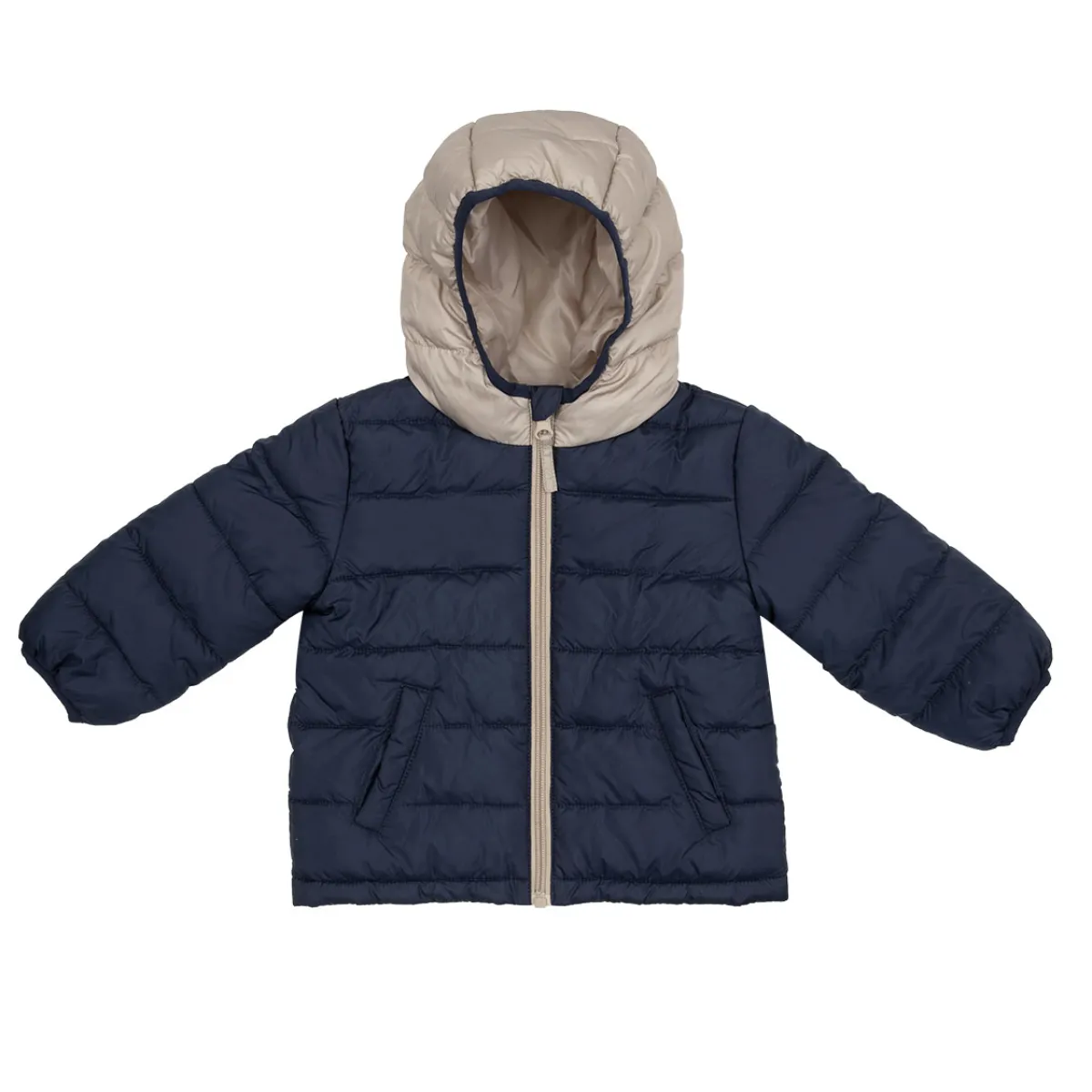 Giacca leggera con cappuccio da bambino. La giacca si sviluppa in blu tinta unita e cappuccio e bordi in beige a contrasto. Modello con tasche. Chiusura frontale con zip. Vestibilità pratica e confortevole. Perfetta per la mezza stagione.