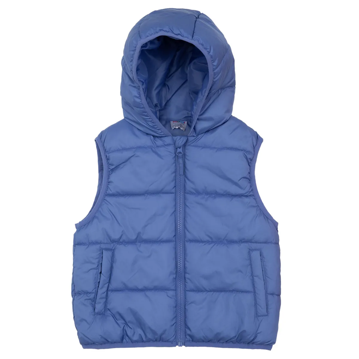 Gilet basic nylon con cappuccio da bambino. Il capo si presenta in total blu. Vestibilià comoda e pratica grazie alla zip intera. Modello con tasche. Accessori non in vendita. La confezione contiene solo il capo d’abbigliamento
