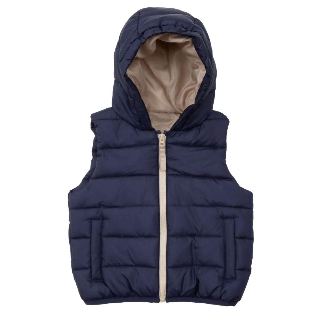 Gilet nylon imbottito con cappuccio e tasche, in colore blu e fodera a contrasto beige. Ideale per ogni occasione. Disponibile in diverse varianti colore.