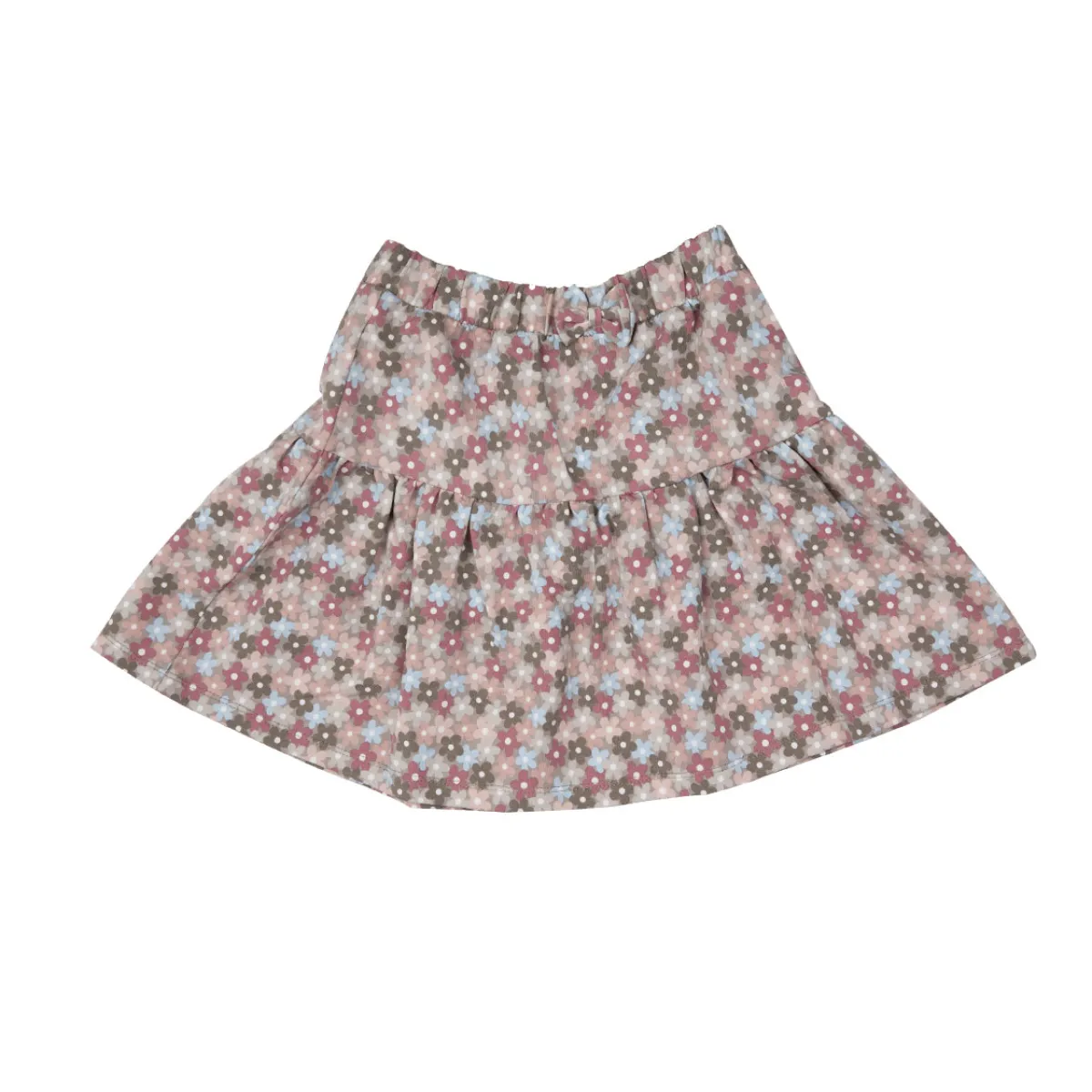 Gonna in morbida felpa fondo beige all over fiorellini. La balza al fondo e la vestibilità rendono elegante e versatile il capo.