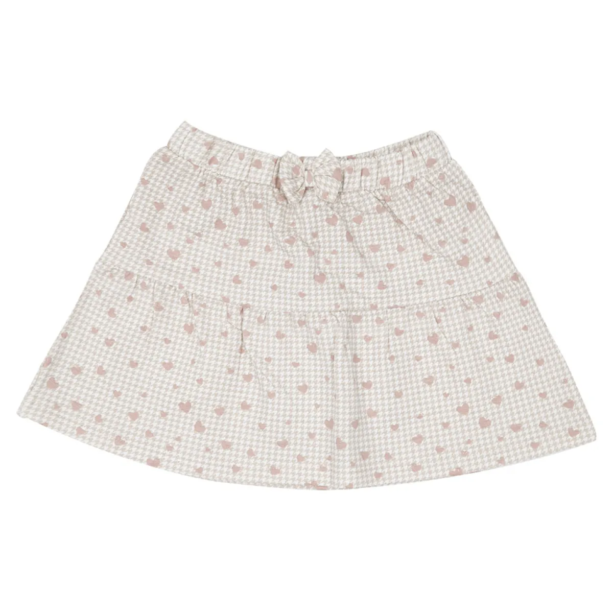 Gonna felpata da bambina. Il capo si presenta in colorazione di base beige trama a quadri e stampa allover cuoricini. Modello a balze morbide, con fiocchetto decorativo in girovita. Accessori non in vendita. La confezione contiene solo il capo d’abbigliamento