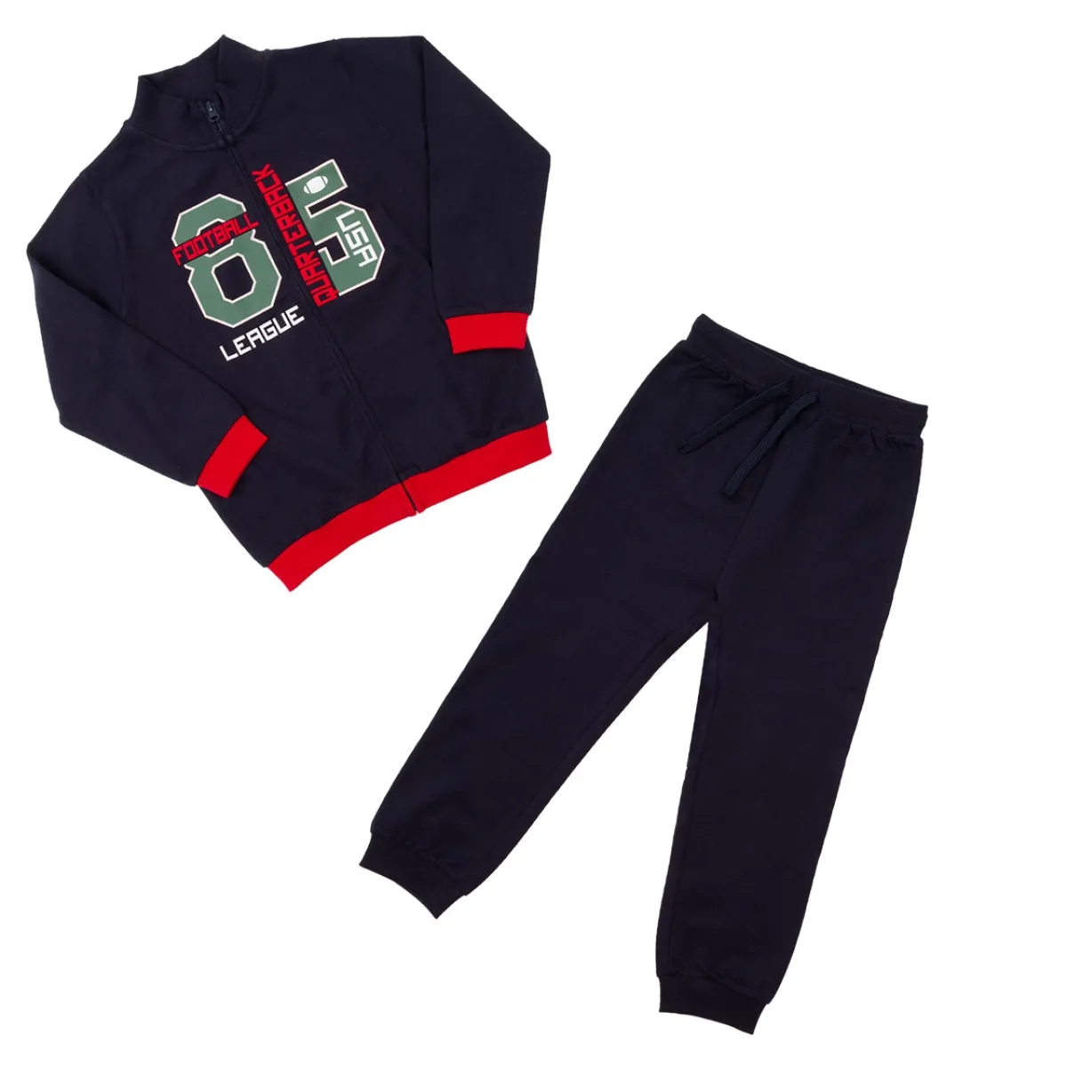 Completo jogging in morbida felpina in colore blu con stampa. L’apertura con zip per la felpa e la vita elasticata per il pantalone rendono comfortevole il capo e adatto ad ogni occasione.