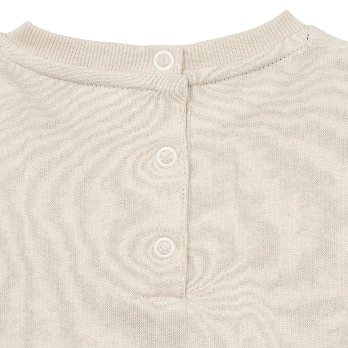 Completo jogging in morbida felpina con top con rouches e pantalone elasticato in vita, in colore beige e blu con stampa simpatici ricci.