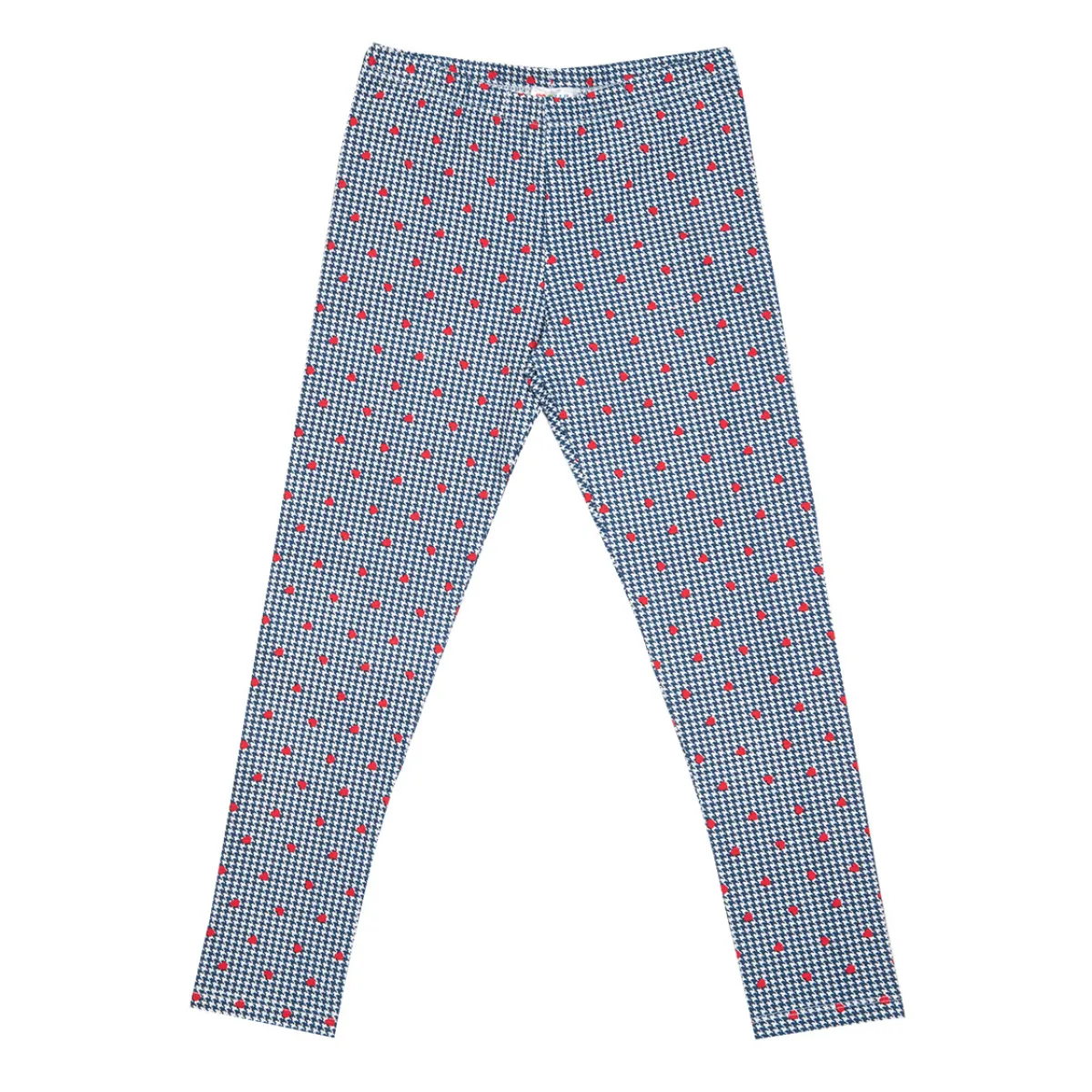 Basici leggings da bambina. Leggings lunghi da bambina in fantasia a grechine bianche e blu decorata con allover rosso a contrasto. Vita elasticata per una vestibilità pratica e confortevole.