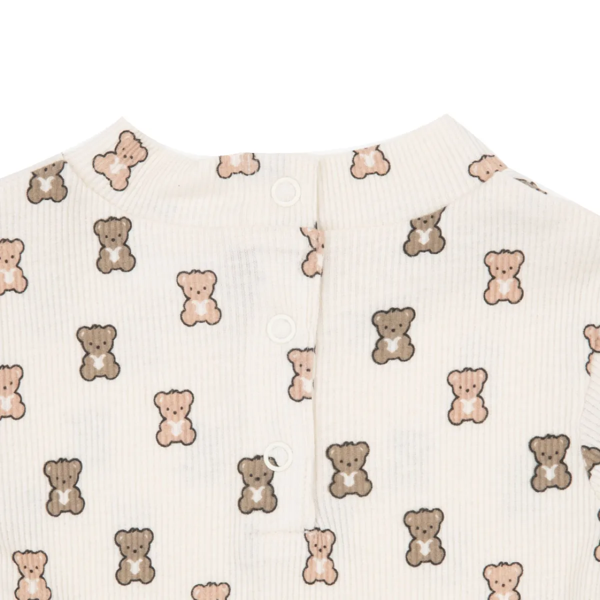 Maglia modello lupetto costina a maniche lunghe da bambina. Il capo si presenta in colorazione total bianco panna con stampa allover “orsetti”. La vestibiilità è morbida e pratica grazie ai bottoni a clip sulla schiena. Accessori non in vendita. La confezione contiene solo il capo d’abbigliamento