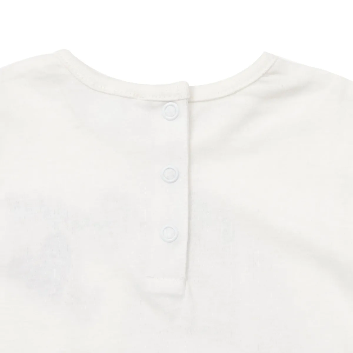 T-shirt manica lunga con polsini elasticizzati con rouches, in morbido caldo cotone in colore panna con stampa. L’apertura sul retro con bottoni a pressione facilita il passaggio testa. Disponibile in diverse varianti.