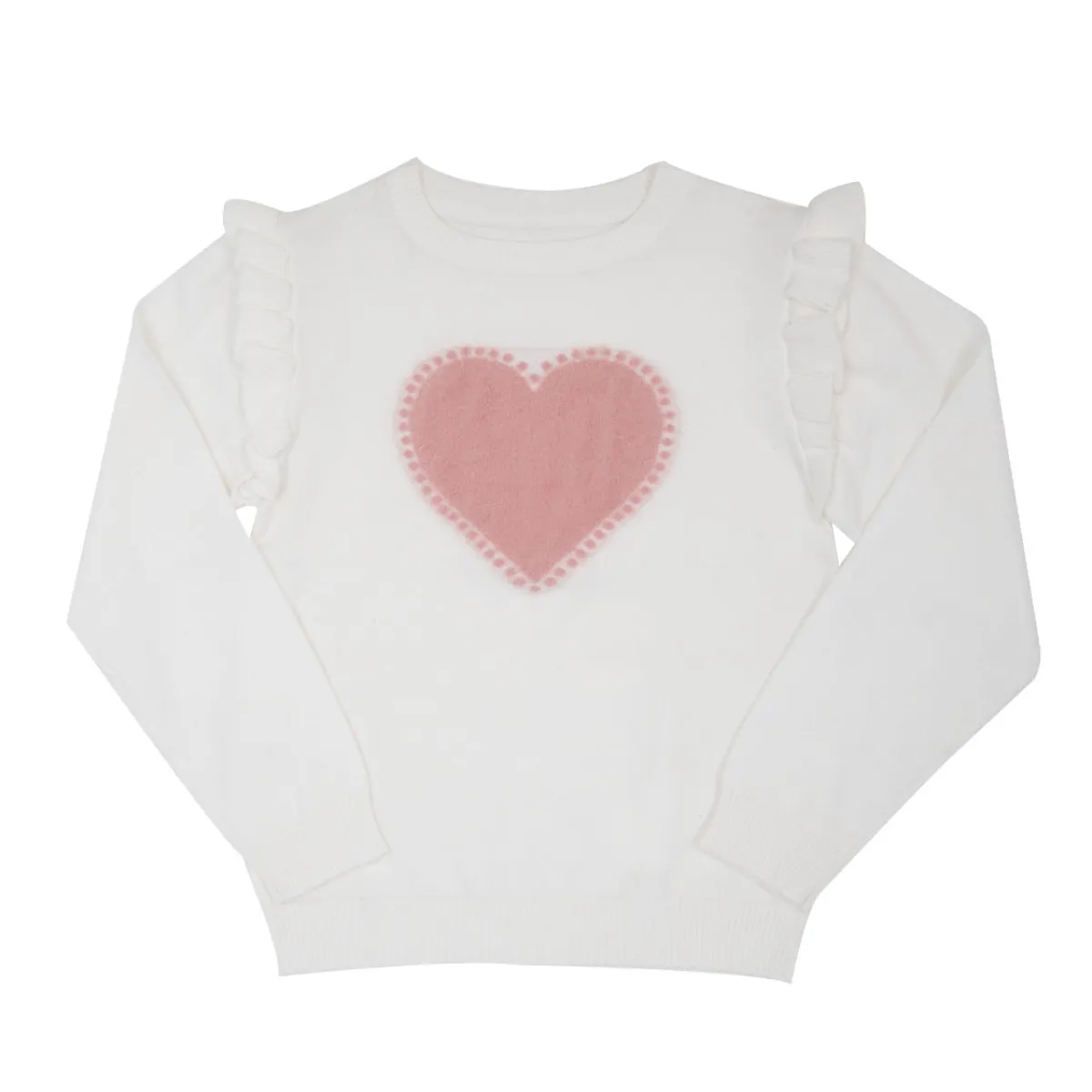 Maglia tricot a maniche lunghe da bambina. Il capo si presenta in colorazione total bianco panna con stampa grande “cuore”. Modello girocollo con rouches sulle spalle. La vestibiilità è morbida. Accessori non in vendita. La confezione contiene solo il capo d’abbigliamento