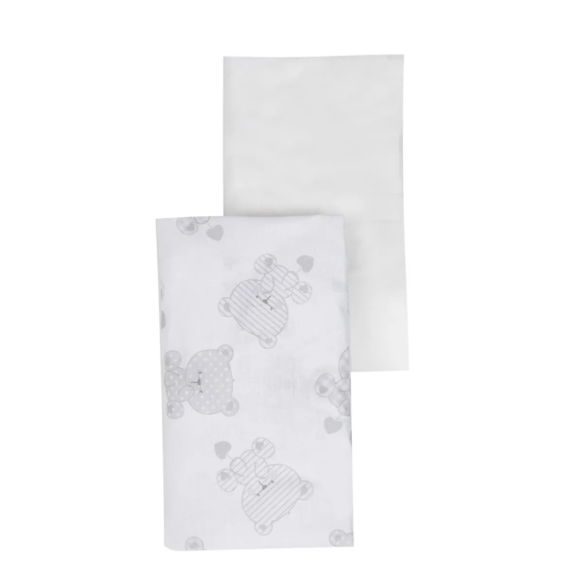 Lenzuolo con angoli per culla e carrozina. Pack di due lenzuola: una in tinta unita grigio e una in stampa fantasia faccina di orsetti grigi. Coordinabile a tutta l’offerta unisex di tessile lettino Mawi. Dimensioni lenzuolo 35*75 cm.