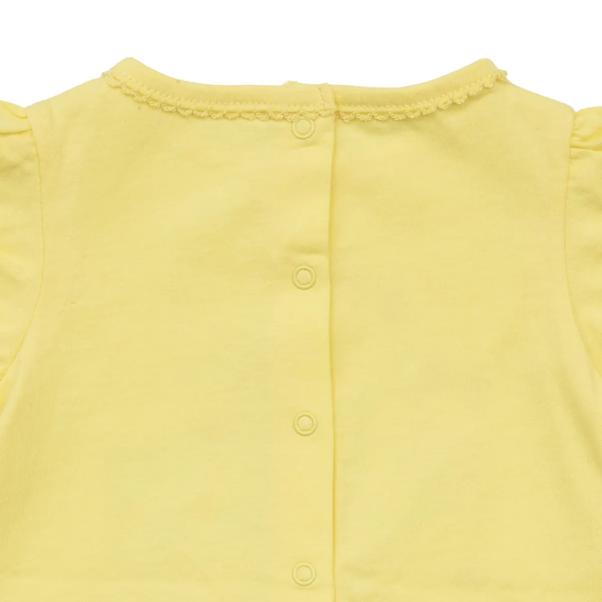 Fresco pagliaccetto jersey da bambina. Il capo si sviluppa su base gialla con stampa gattini sul davanti. La vestibilità è mobirda e pratica grazie a bottoni a clip sul retro e sul cavallo.