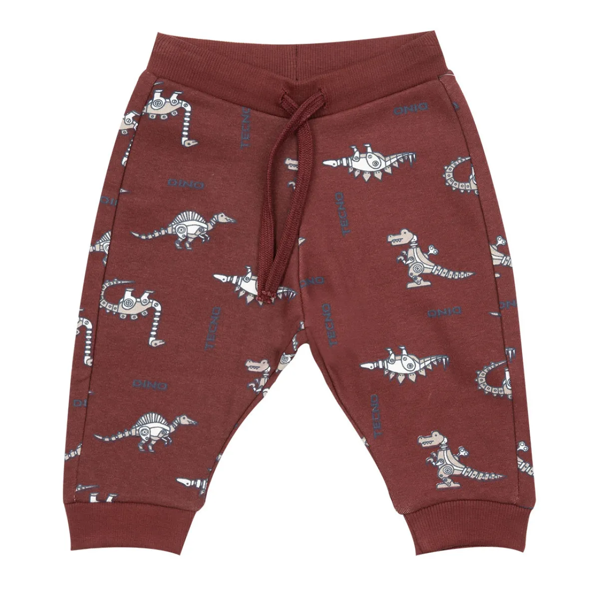 Pantalone in morbida felpa garzata bordeaux, fantasia all over dinosauri. Le costine e la vestibilità donano confot al capo.