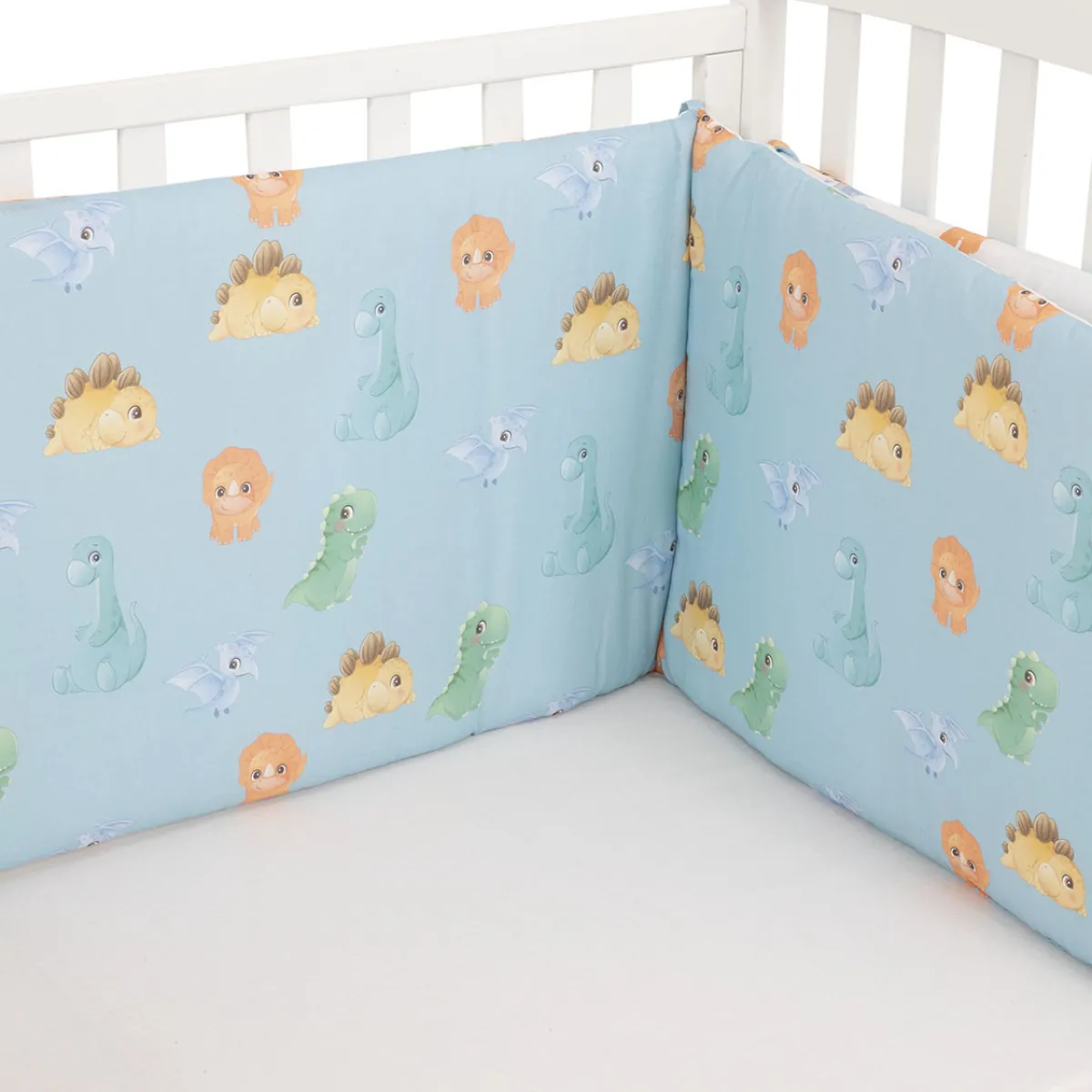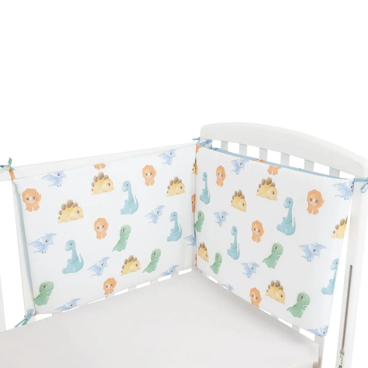 Paracolpi per lettino da bambino. il paracolpi si presenta con fondo bianco e stampa multicolor a tema “Dino”. La sua conformazione ne garantische morbidezza e protezione per il bambino.