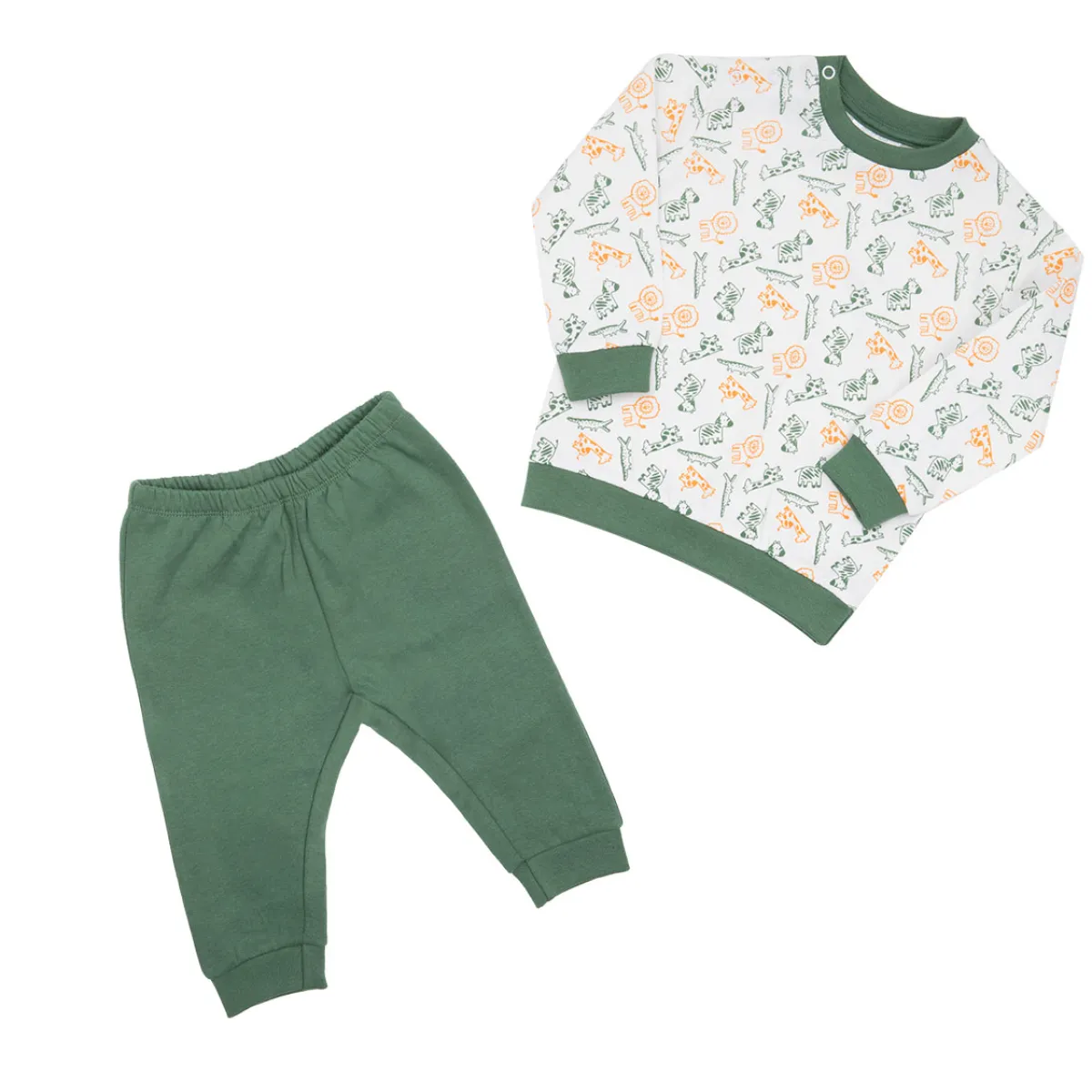 Pigiama due pezzi da bambino. Il capo si compone di maglia a maniche lunghe su base binaca con stampa allover “animali” e particolari verde; i pantaloni coordinati sono in tinta unita verde scuro. La vestibilità è morbida e pratica grazie a elastico in girovita, su polsini e caviglie, e grazie ai bottoni a clip ad altezza girocollo. Accessori non in vendita. La confezione contiene solo il capo d’abbigliamento