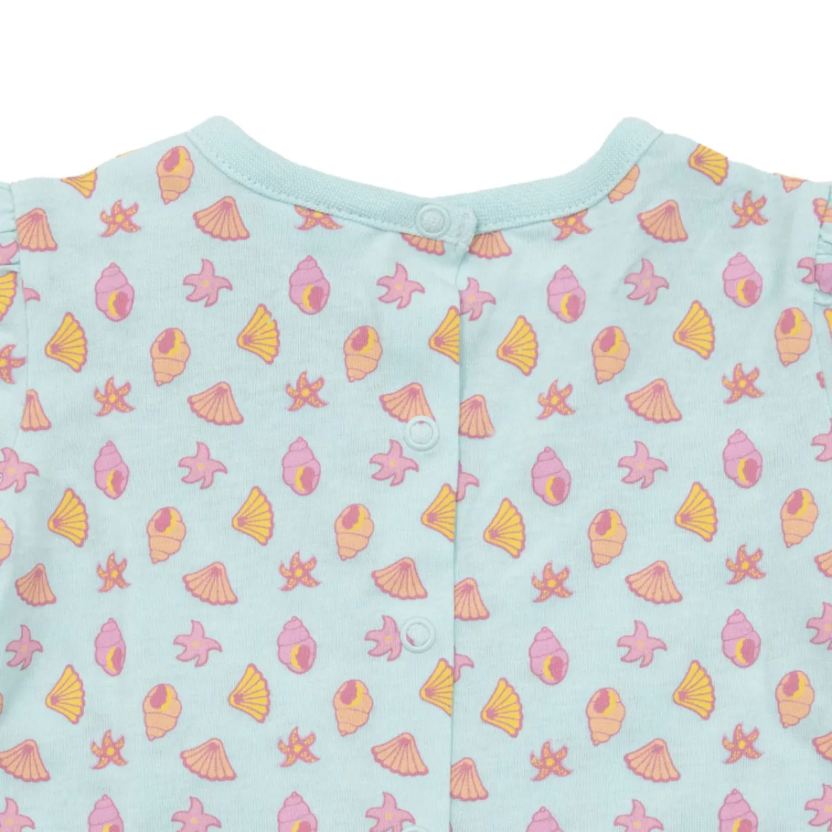 Pigiama estivo intero da bambina. Il capo si sviluppa su base rosa con stampa allover a tema conchiglie. Modello girocollo. La vestibilità è morbida e pratica grazie a bottoni a clip sulla schiena e sul cavallo. Accessori non in vendita. La confezione contiene solo il capo di abbigliamento