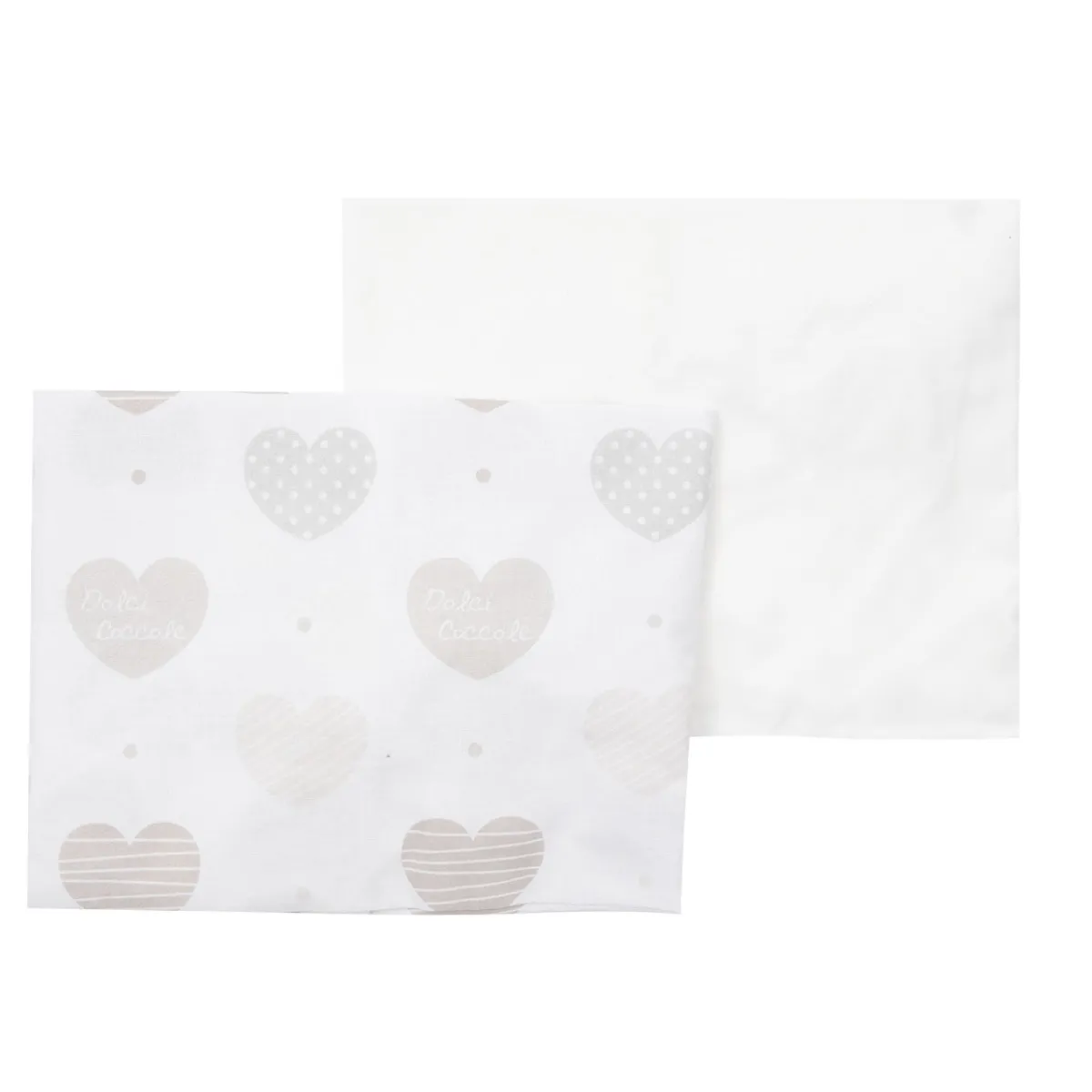Completo 2 pezzi unisex in 100% cotone adatto per culle. Il set è composto da: lenzuolo sotto, e lenzuolo sopra. Il lenzuolo superiore con sfondo bianco presenta una fantasia a cuori grigi e beige. Il lenzuolo sotto è a tinta unita bianco. Il completo è delicato e leggero.