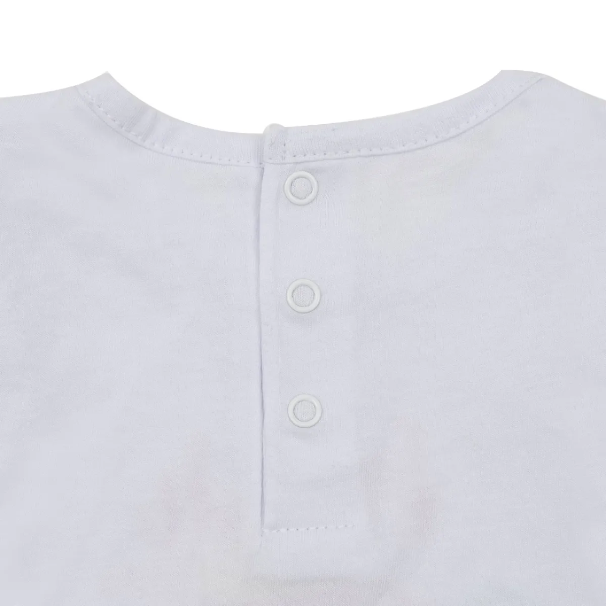 Canotta e shorts jersey da bambina. Il capo superiore si presenta in bianco con stampa simpatica sul davanti, rouches sul giromanica e comodi bottoni a clip sul retro per massimizzare la comodità e la praticità; il capo inferiore abbinato si presenta di colore rosa con rouches sul girogamba e comodo elastico regolabile in girovita.