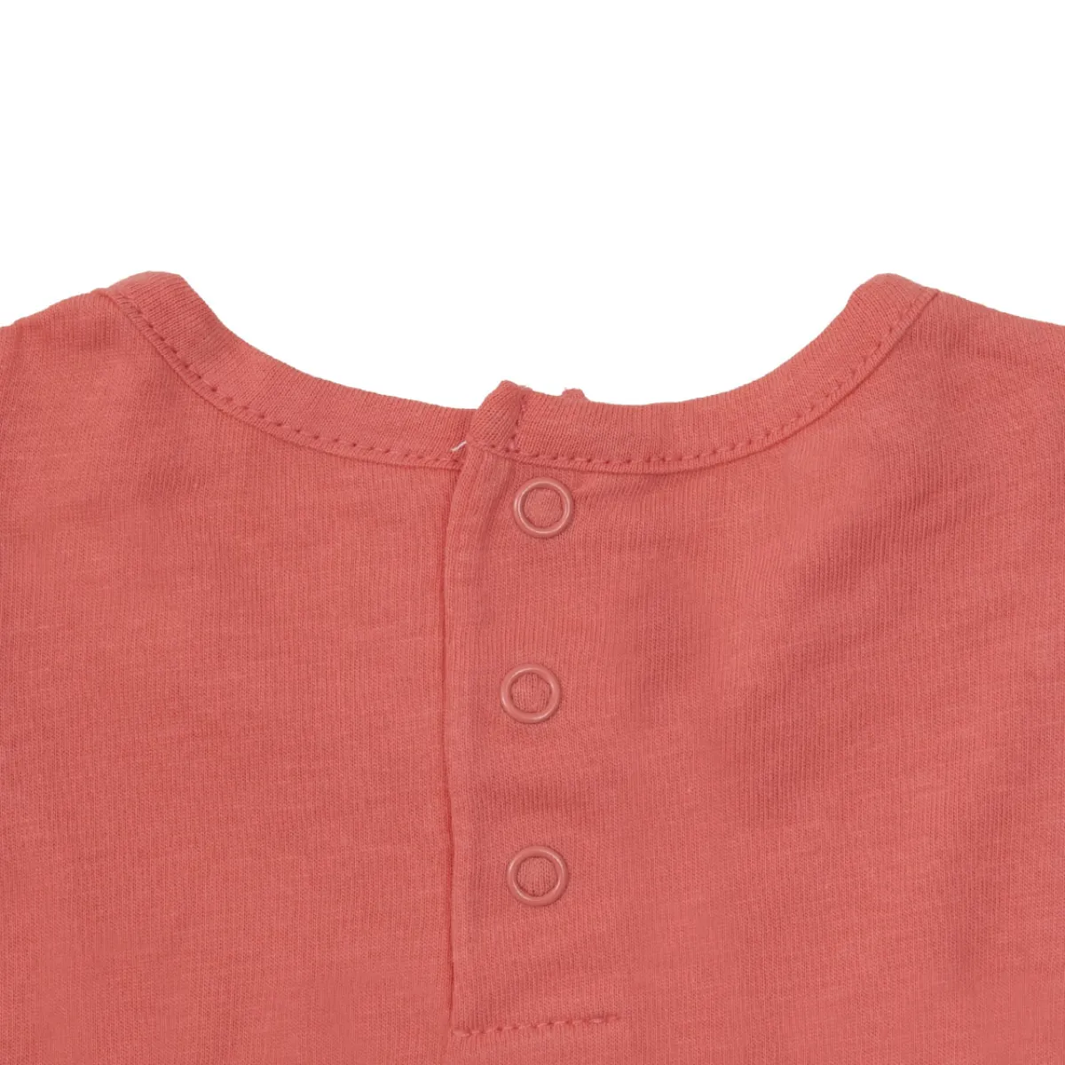 Canotta e shorts jersey da bambina. Il capo superiore si presenta in corallo con stampa simpatica sul davanti, rouches sul giromanica e comodi bottoni a clip sul retro per massimizzare la comodità e la praticità; il capo inferiore abbinato si presenta di colore verde chiaro con rouches sul girogamba e comodo elastico regolabile in girovita.