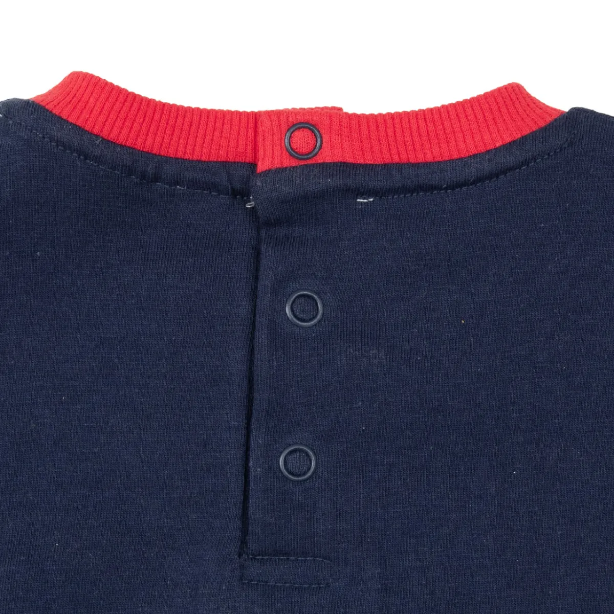Set estivo da bambino composto da maglietta mezza manica e pantalcino. Il capo superiore si sviluppa su base blu con maniche rosse e stampa simpatica sul davanti, la parte inferiore si sviluppa in tinta unita rosso con cordino blu coordinato. Presente tasca sul retro del pantaloncino. La vestibilità è morbida e pratica grazie ai bottoni a clip sulla schiena e a elastico in girovita regolabile.Accessori non in vendita. La confezione contiene solo il capo d’abbigliamento