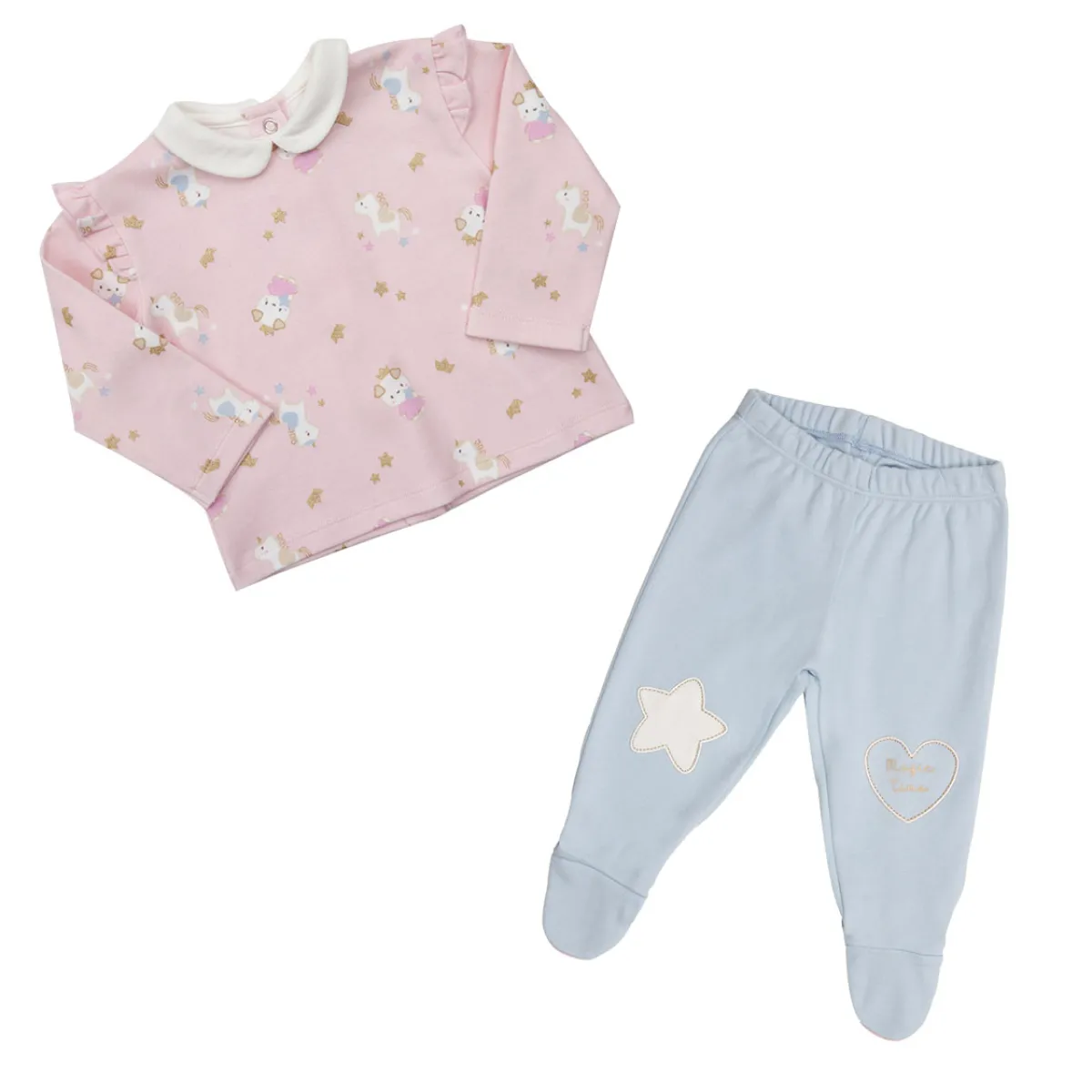 Delizioso set due pezzi in caldo cotone. Top fantasia multicolor animaletti e unicorni con rouches su manica e ghettina con applicazioni tulle su ginocchio.Il capo presenta una comoda apertura sul retro del top. Vestibilità comoda.