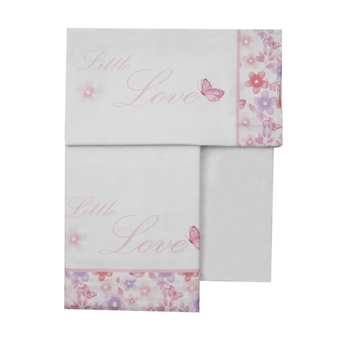 Set 3 pezzi lettino bambina composto da federa lenzuolo con angoli e lenzuolo sopra. Banda lenzuolo con scritta “little love” , fantasia fiori e farfalle multicolor. Stampa con scritta “sweet love”, banda fantasia fiori e farfalle multicolor. Lenzuolo con angoli tina unita rosa. Dimensioni: Lenzuolo sotto 120*180 cm Lenzuolo sopra 60*135*20 cm Federa 35*60 cm.