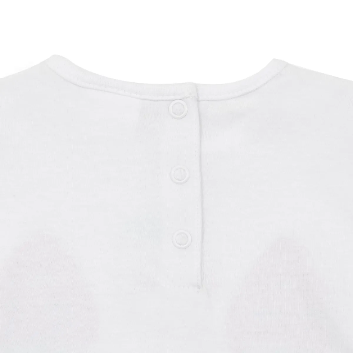 Canotta e shorts jersey da bambina. Il capo superiore si presenta in total bianco con stampa fragole grandi sul davanti, presenti rouches sul giromanica e comodi bottoni a clip sul retro per massimizzare la comodità e la praticità; il capo inferiore abbinato si presenta di colore rosa con rouches sul girogamba e comodo elastico regolabile in girovita.