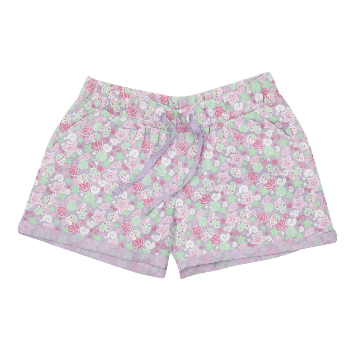 Pantaloncino morbido da bambina. Il capo si presenta con sfondo lilla e stampa allover a tema marino verde e rosa. La vestibilià è morbida e pratica grazie a elastico regolabile in girovita. Modello con tasche lateragli a taglio trasversale. Accessori non in vendita. La confezione contiene solo il capo d’abbigliamento