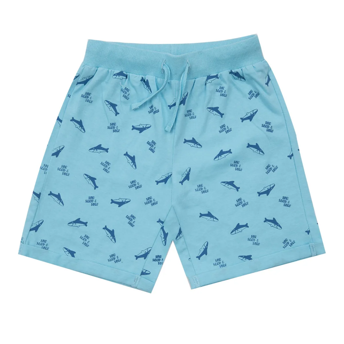 Pantaloncino morbido da bambino. Il capo si presenta in colorazione azzurro con stampa allover “squalo”. Modello con tasca posteriore. La vestibilità è morbida e pratica grazie all’elastico in girovita regolabile. Lo short è facilmente combinabile per vari look.