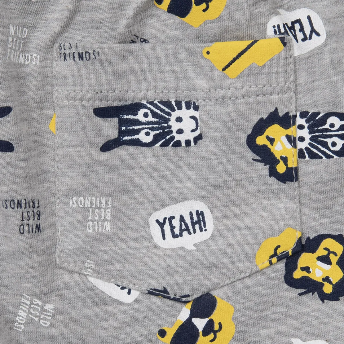 Pantaloncino morbido da bambino. Il capo si presenta in colorazione grigio chiaro con stampa allover “animali simpatici”. Modello con tasca posteriore. La vestibilità è morbida e pratica grazie all’elastico in girovita regolabile. Lo short è facilmente combinabile per vari look.