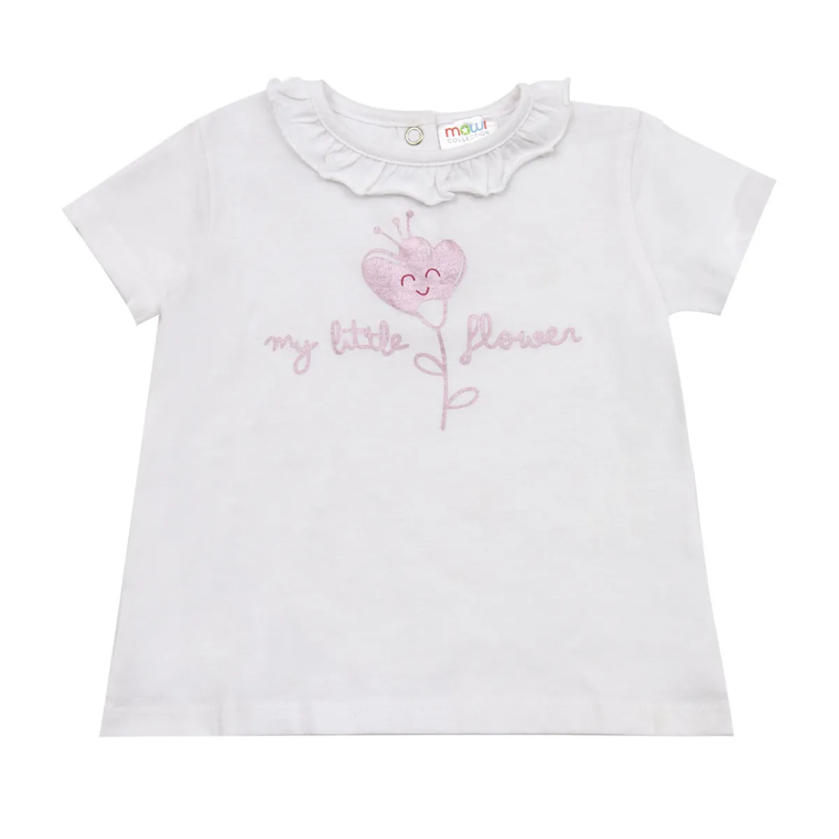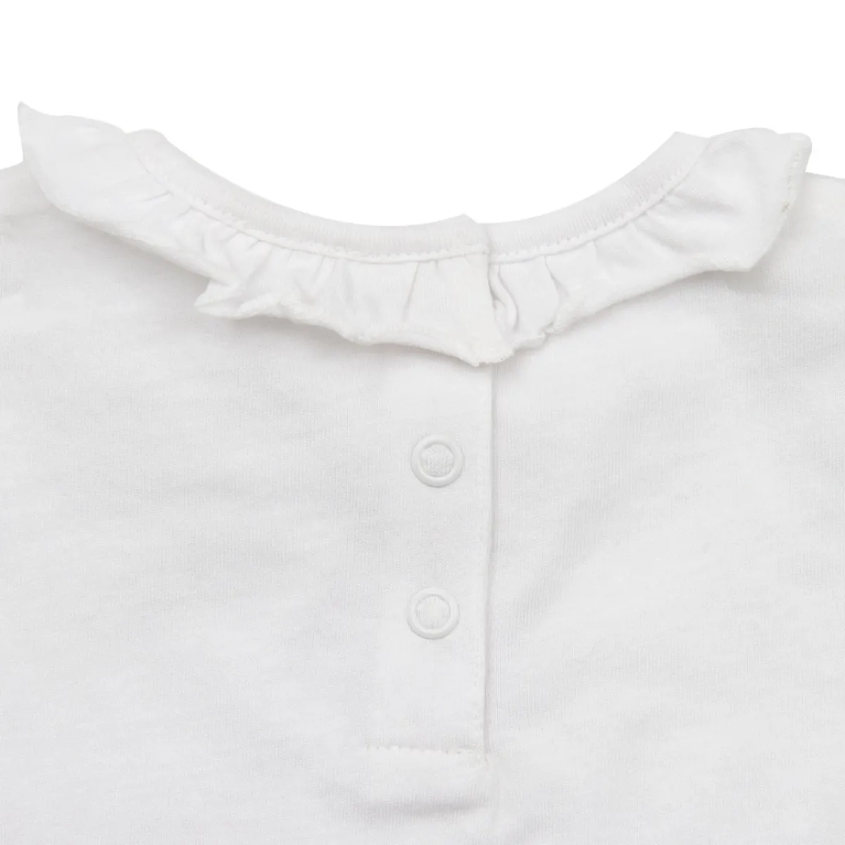 T-shirt in morbido jersey di cotone, con frill al collo e ricamo al petto. L’apertura sul retro dona comfort al capo.