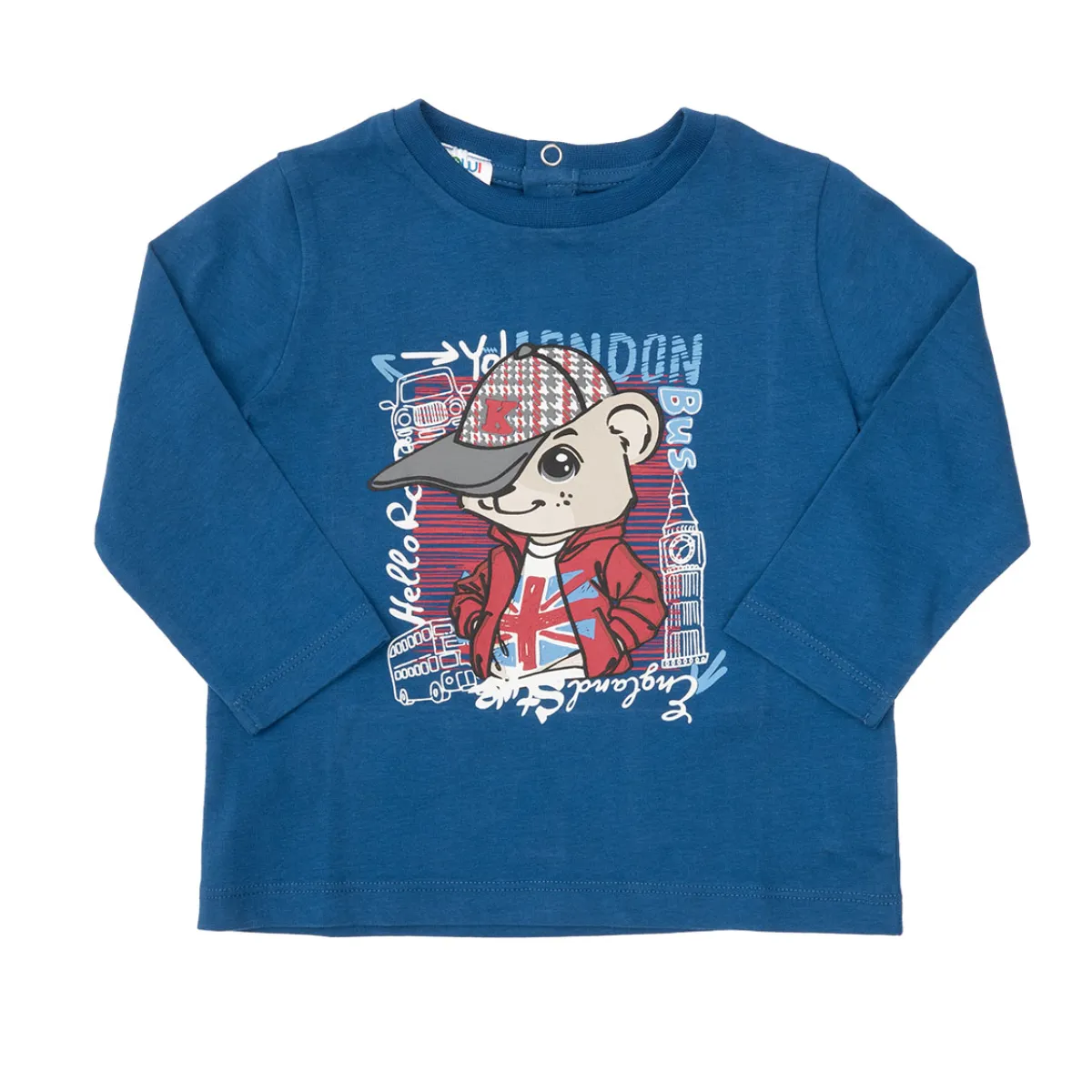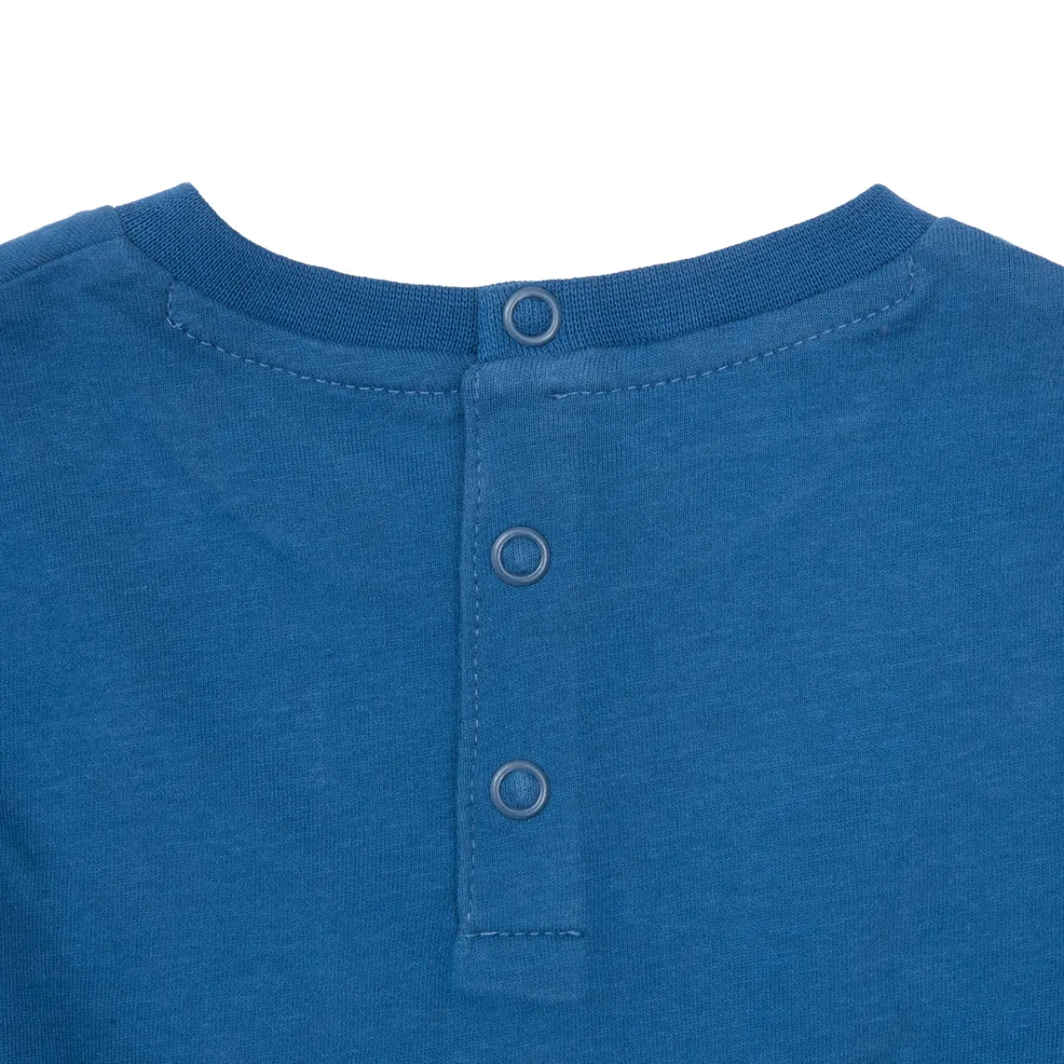 Maglia jersey a maniche lunghe da bambino. Il capo si presenta in colorazione blu con stampa simpatica sul davanti. La vestibiilità è morbida e pratica grazie ai bottoni a clip sulla schiena. Modello girocollo. Accessori non in vendita. La confezione contiene solo il capo d’abbigliamento