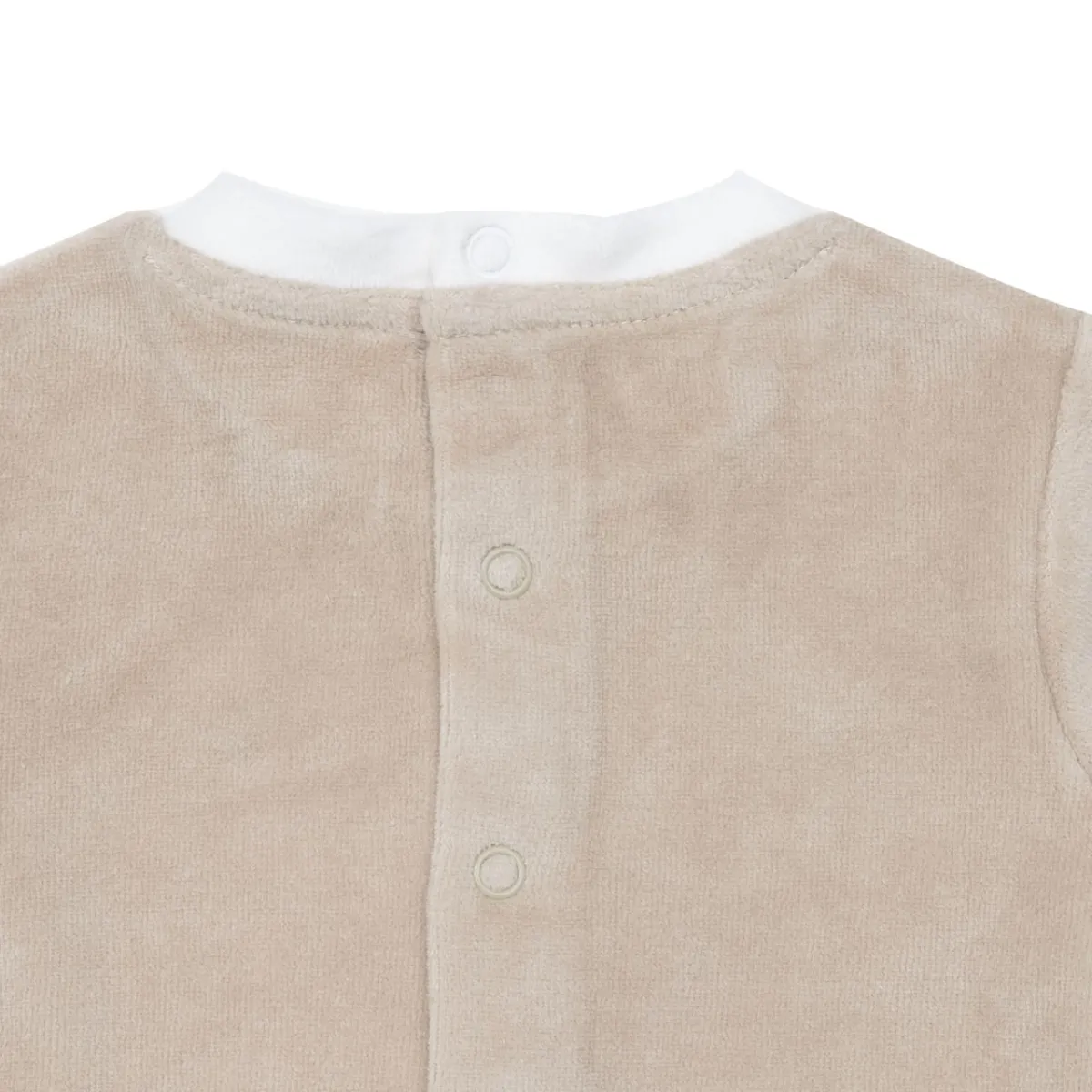 Tenera tutina ciniglia da bambino. Il capo si presenta in un pezzo unico con piedini ed in tonalità beige con particolari blue, presente stampa sul davanti “orsetto”. La vestibilità è morbida e pratica grazie a bottoni a clip sul retro e sul cavallo. Accessori non in vendita. La confezione contiene solo il capo d’abbigliamento