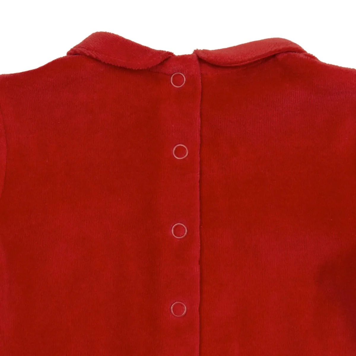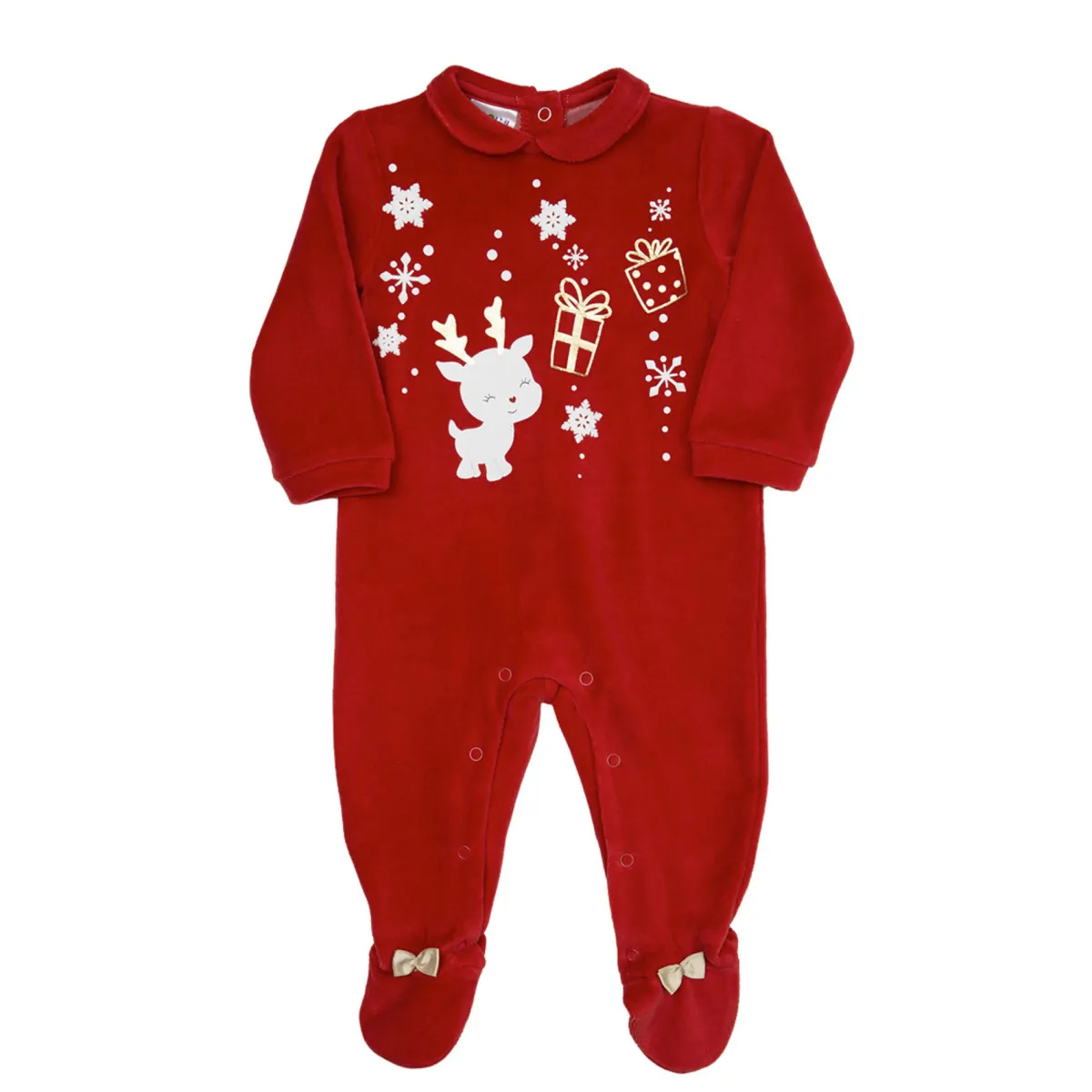 Deliziosa tutina ciniglia rosso natale con una preziosa grafica con animaletto e fiocchi di neve arricchita da lamina. Perfetta per l’outfit natalizio del tuo bebè e ottima come idea regalo. Oltre all’apertura sul retro,presenta una comoda apertura entrogamba per facilitare il cambio del pannolino.