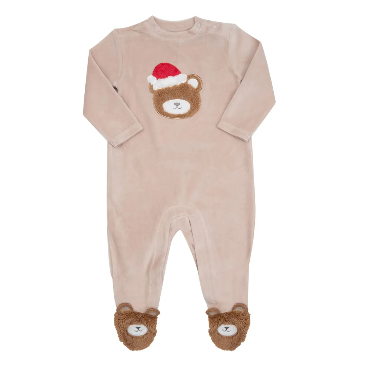 Tenera tutina ciniglia unisex. Il capo si presenta in un pezzo unico con piedini su base beige e stampa in rilievo “orsetto natalizio”. La vestibilità è morbida e pratica grazie ad apertura ad altezza girocollo e sul cavallo con bottoni a clip. Accessori non in vendita. La confezione contiene solo il capo d’abbigliamento