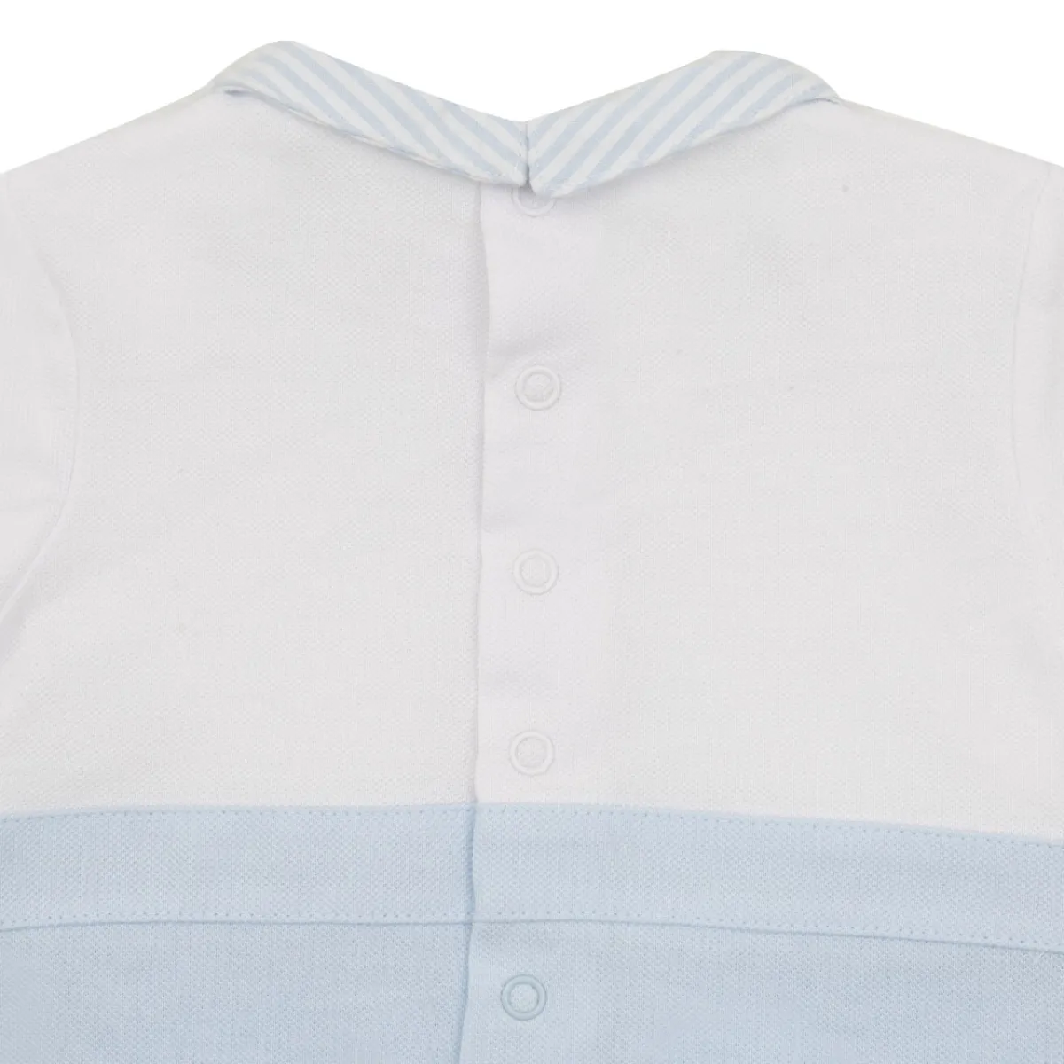 Tutina bicolor da bambino. Il capo si presenta con la parte superiore in bianco e la parte inferiore azzurro chiaro, e con colletto e cinturia rigati a richiamo. Presenti inserti e bottoni classici. La vestibilità è morbida e pratica grazie a bottoni a clip sulla schiena e sul cavallo.Accessori non in vendita. La confezione contiene solo il capo d’abbigliamento