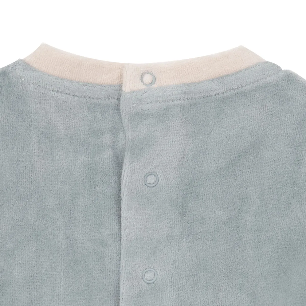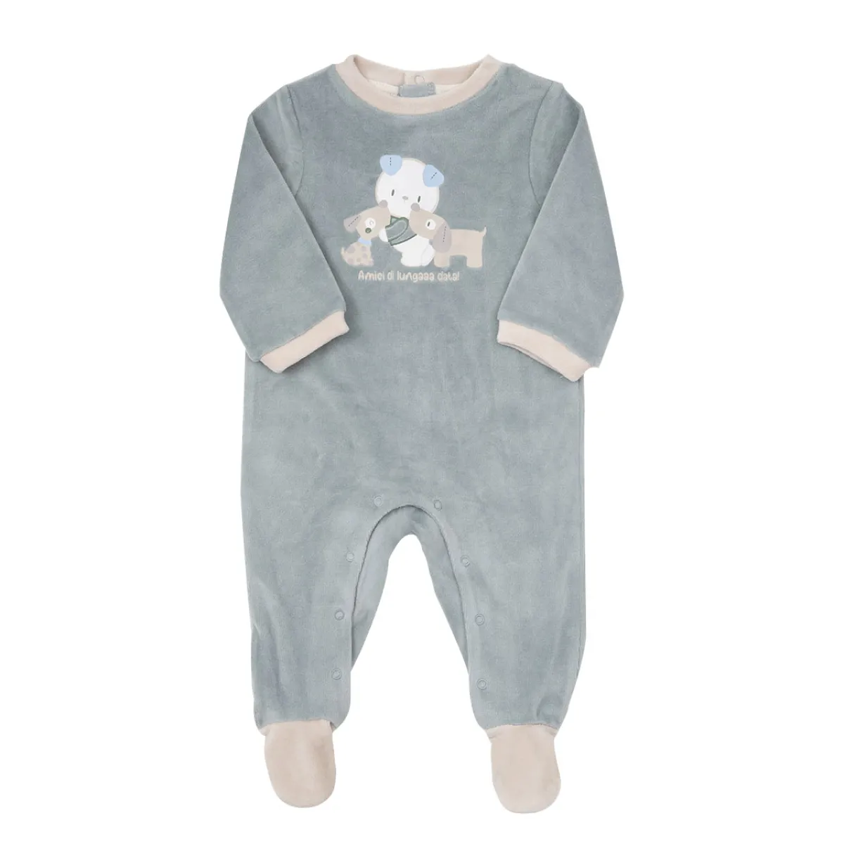 Tenera tutina ciniglia da bambino. Il capo si presenta in un pezzo unico con piedini ed in tonalità verde con particolari beige, presente stampa sul davanti animaletti. La vestibilità è morbida e pratica grazie a bottoni a clip sul retro e sul cavallo.Accessori non in vendita. La confezione contiene solo il capo d’abbigliamento