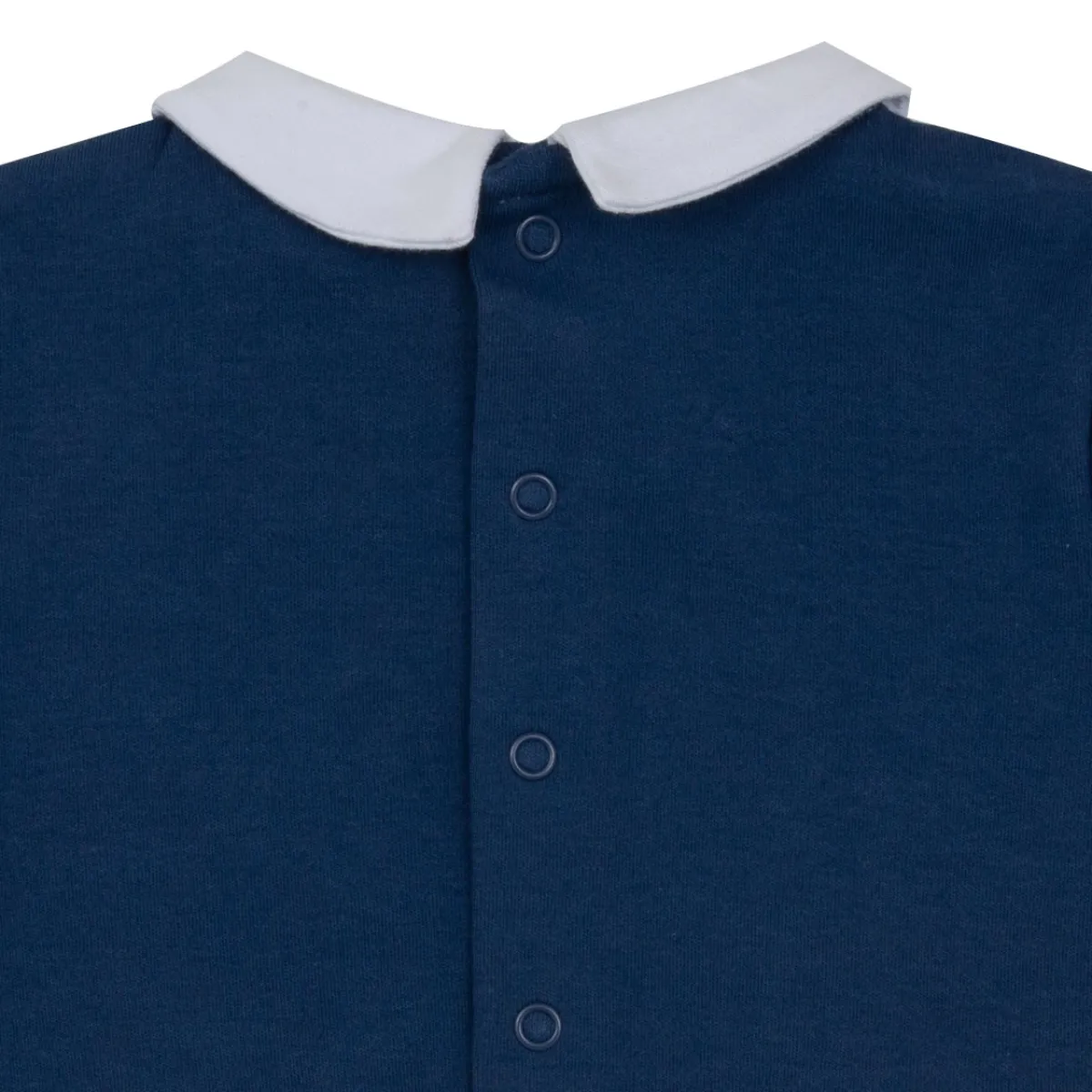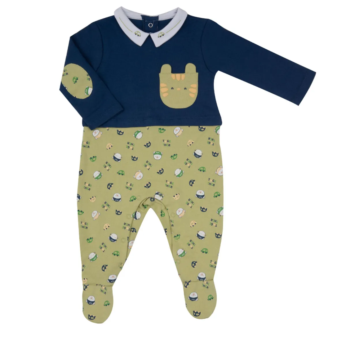 Tenera tutina intera da bambino. Il capo si presenta in un pezzo unico con piedini e colletto, La parte superiore in tinta blu con simpatica patch animaletto e toppe sule maniche, la parte inferiore verde con stampa allover coordinata. La vestibilità è morbida e pratica grazie ai bottoni a clip sul resto e sul cavallo. Accessori non in vendita. La confezione contiene solo il capo d’abbigliamento