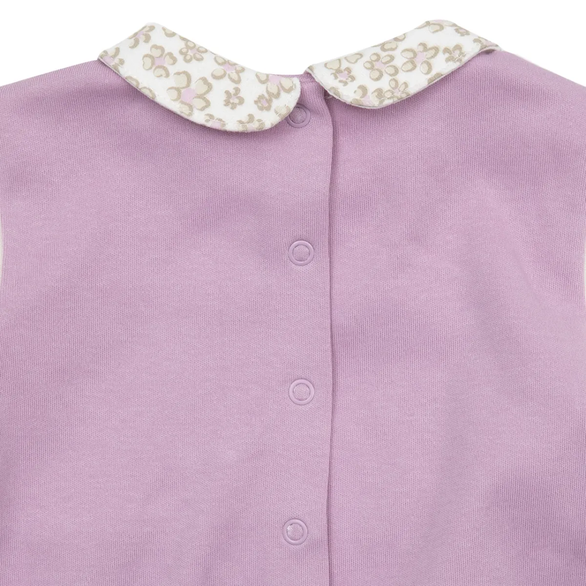 Tenera tutina bicolor da bambina. Il capo si presenta in un pezzo unico con piedini ed in tonalità panna e lilla con particolari a giori. Modello con colletto alla peter-pan. La vestibilità è morbida e pratica grazie a bottoni a clip sul retro e sul cavallo.Accessori non in vendita. La confezione contiene solo il capo d’abbigliamento