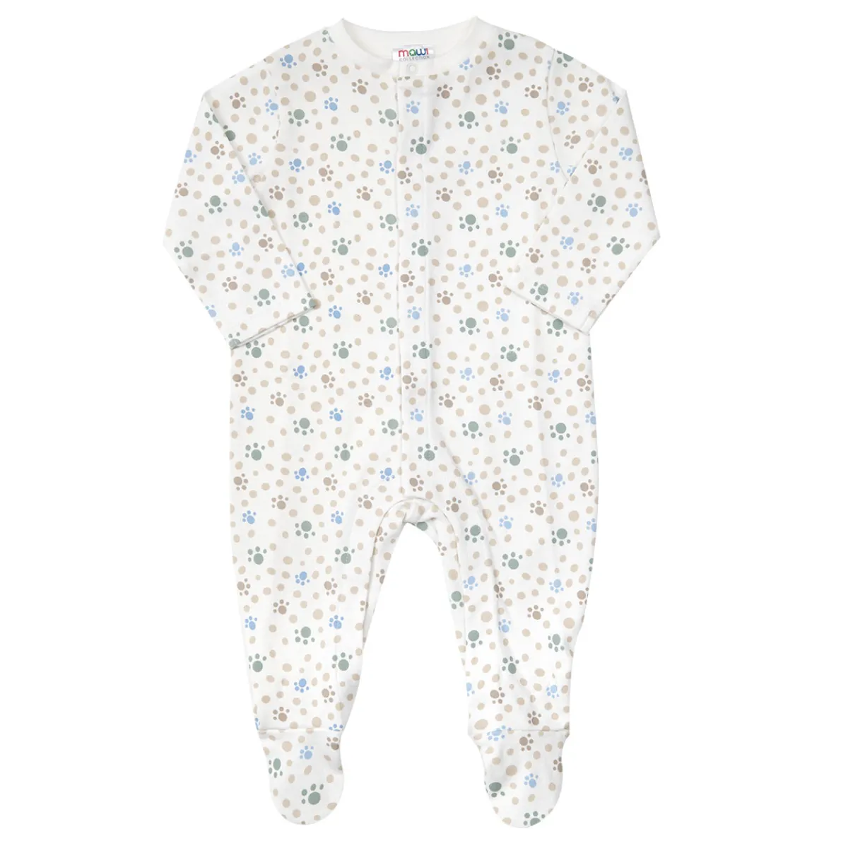Tenera tutina da bambino. Il capo si presenta in un pezzo unico con piedini ed in tonalità bianco panna e stampa allower multicolor. La vestibilità è morbida e pratica grazie a bottoni a clip sul davanti e sul cavallo. Accessori non in vendita. La confezione contiene solo il capo d’abbigliamento