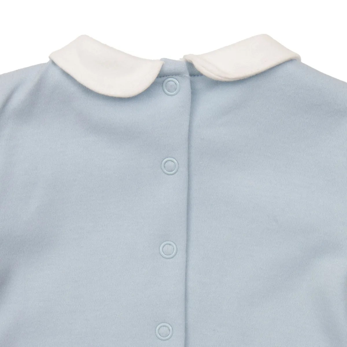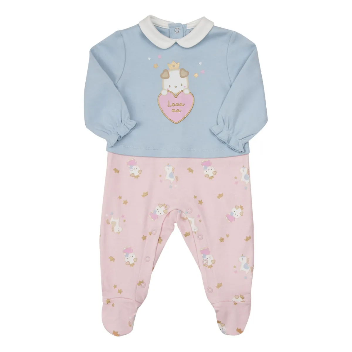 Dolcissima tutina in caldo cotone bicolore azzurra e rosa con inserto fantasia sul fondo . Arricchita da una preziosa stampa con dettagli dorati. Oltre all’ apertura sul retro presenta una comoda apertura entrogamba per facilitare il cambio del pannolino. Vestibilità comoda.