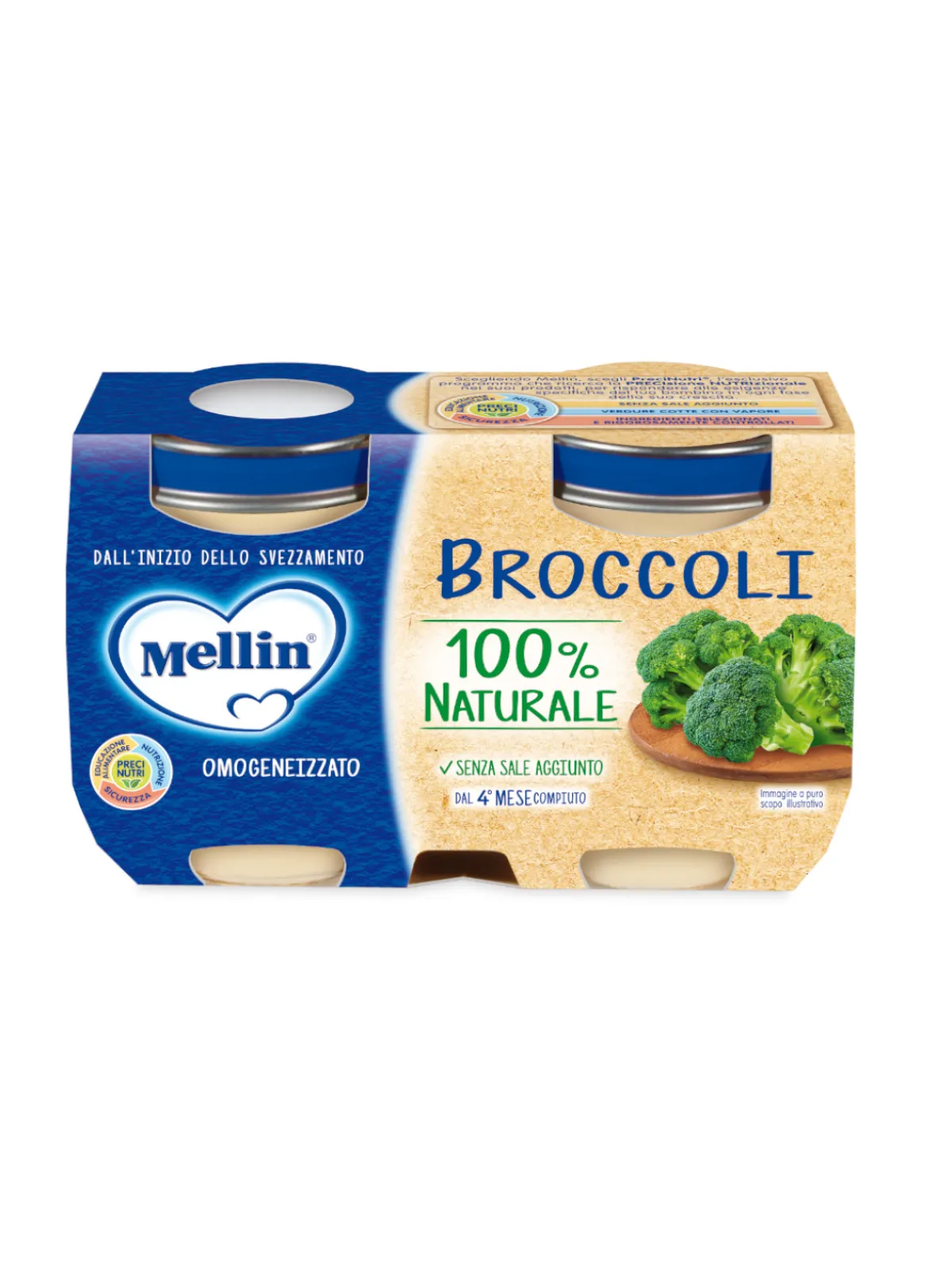 L’omogenizzato di broccoli Mellin con PreciNutri è senza sale aggiunto, senza conservanti e coloranti, è cotto al vapore per salvaguardare le qualità organolettiche ed è sottoposto a rigorosi controlli qualitativi. Indicato dal 4° al 36° mese salvo diverso parere del Pediatra.
