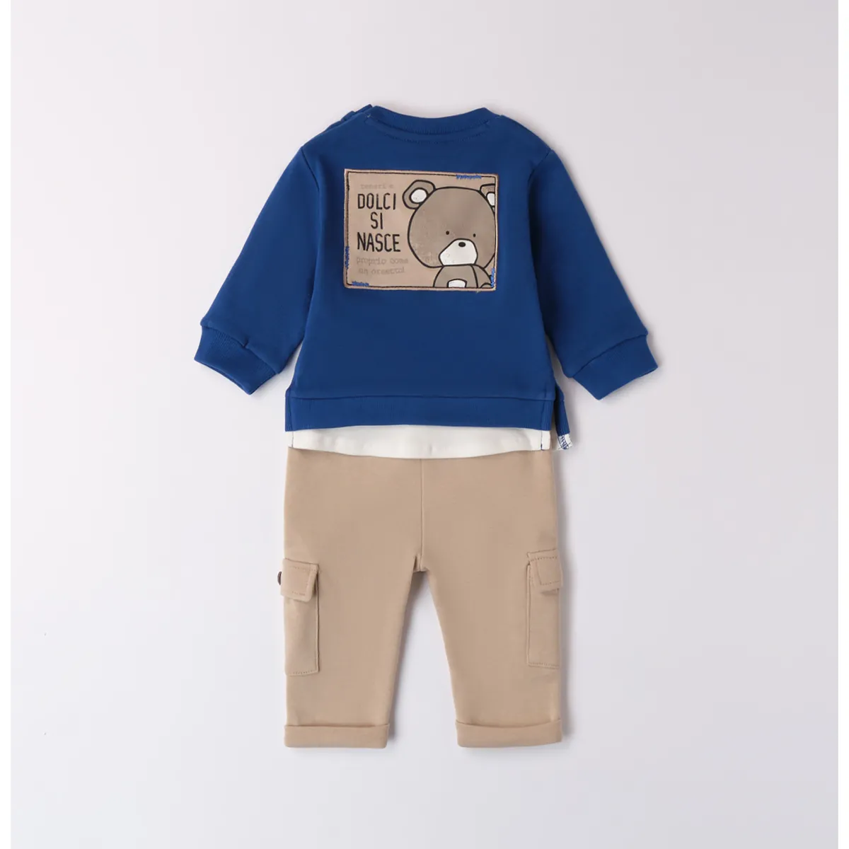Completo due pezzi per neonato iDO 1-24 mesi in felpa invernale 100% cotone. La felpa presenta apertura sulla spalla con bottoni a pressione e inserto sul fondo, finta t-shirt. Grande stamoa sulla schiena. Il pantalone ha vita elasticizzata, tasconi laterali e risvoltini sul fondo. Scopri tutta la selezione di Completi bimbo iDOMini!