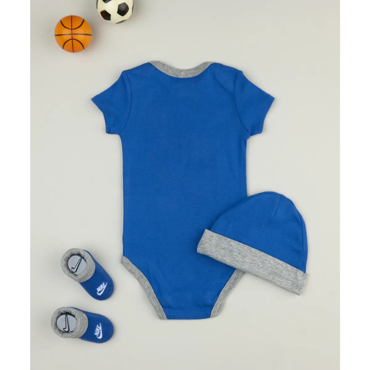 Casual pack Nike da neonato composto da body, cappellino e calzine. Il body si sviluppa in blu acceso con bordo grigio ed è arricchito da una stampa big size logo Nike bianca a contrasto. Apertura al patello con pratici bottoncini a pressione. Scollo all’americana. Berretto blu con risvolto grigio e logo ricamato. Calzine logo nei medesimi colori.