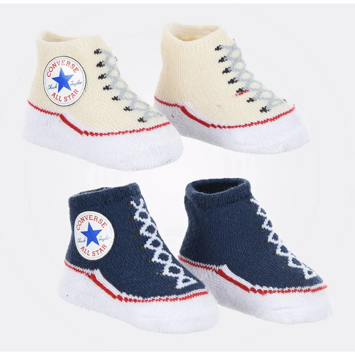 Set composto da due paia di babbucce, un piaio blu e uno panna. Sono decorate con patch logo e rifiniture rosse.Composizione:82%cotone – 16%poliestere – 2%elastan