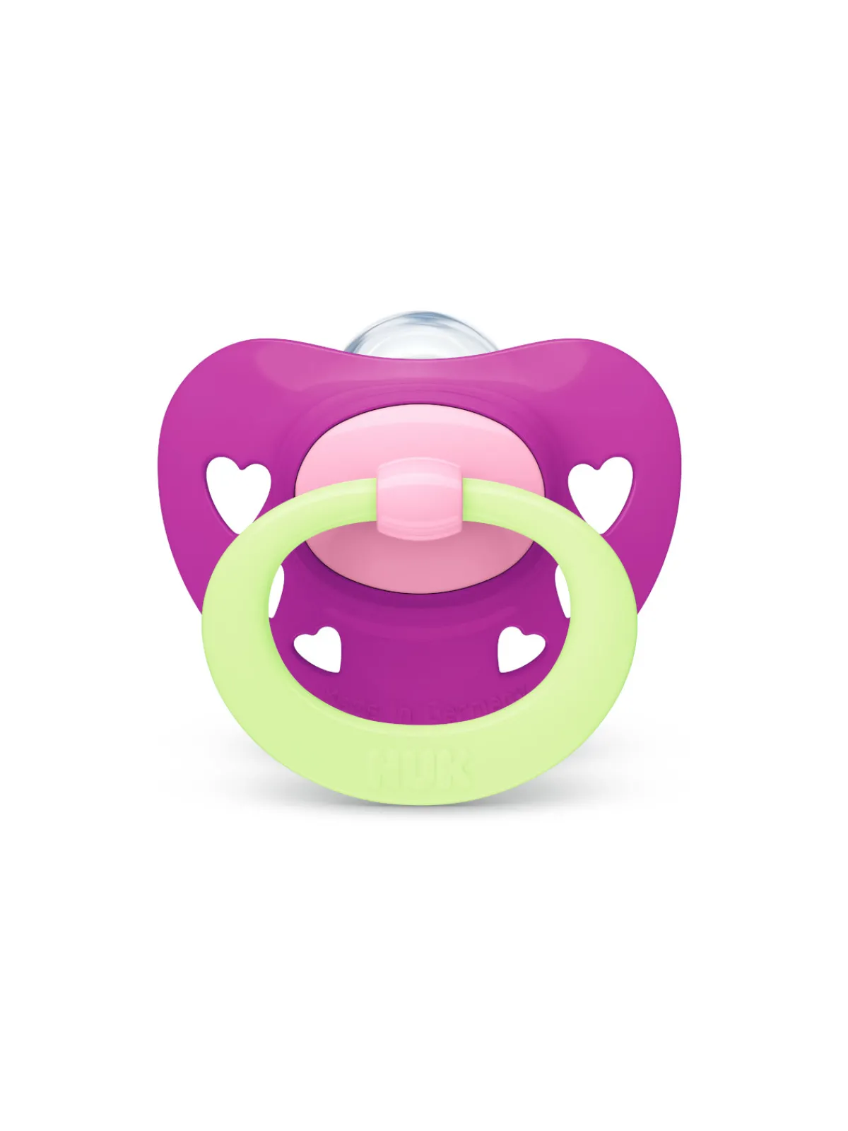 Il collo stretto e sottile riduce la pressione sui denti e sulla mandibola. La testa più piatta e liscia sul fondo della tettina favorisce il naturale movimento di suzione, lasciando ampio spazio nella bocca del bambino e i fori sullo scudo garantiscono il passaggio dell’aria durante la suzione. In tutti i succhietti è presente una valvola NUK Air System che lascia uscire l’aria dalla tettina, aiutando a prevenire le malformazioni della mandibola e le coliche. L’edizione speciale Glow in the Dark permette di trovare facilmente il succhietto anche al buio.
