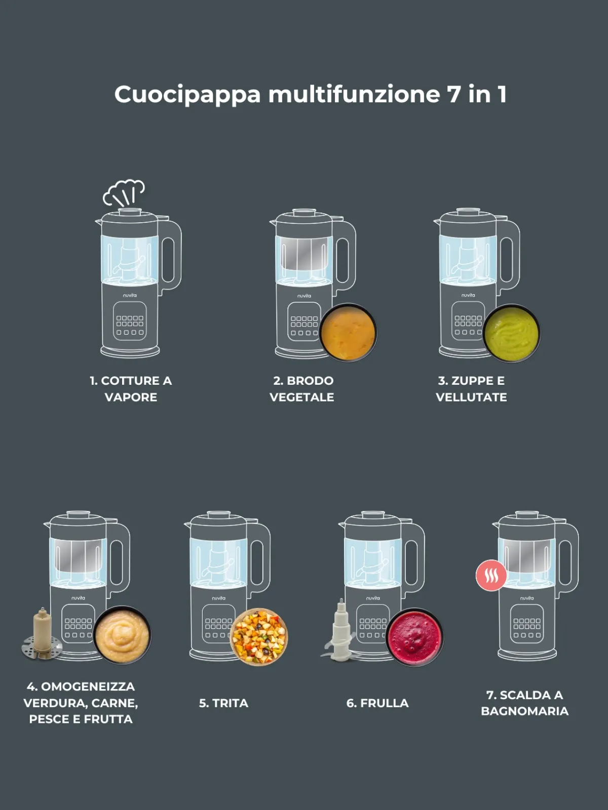 Magic Pappa è il cuoci pappa multifunzione più completo per preparare velocemente pasti freschi, sani e gustosi ogni giorno. 7 funzioni integrate per cuocere a vapore verdure, legumi, carne e pesce, frullare e sminuzzare, tritare, ottenere il brodo vegetale, vellutate, purè, frullati di frutta ed omogeneizzati. Può inoltre essere utilizzato per scaldare a bagnomaria, senza intaccare i principi nutritivi.