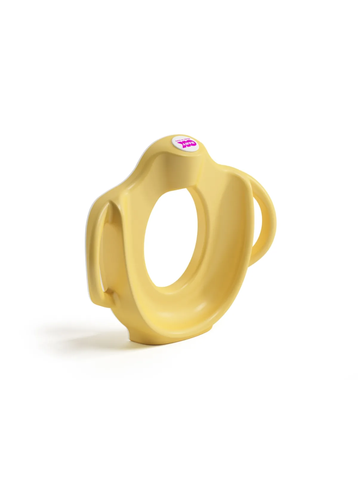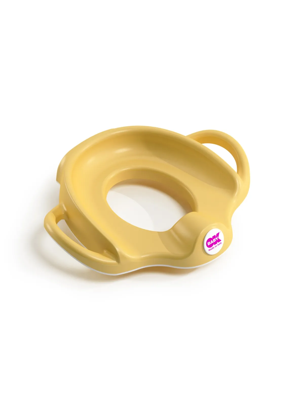 Pratico riduttore wc, con schienale alto e maniglie per un comodo appoggio del bimbo. Bordo antiscivolo per una perfetta aderenza al wc .