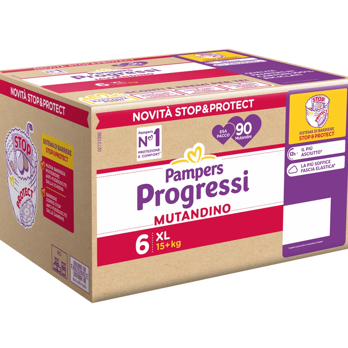 Pampers Progressi Mutandino è il nuovo pannolino a mutandina con una fascia elastica avvolgente a 360° che rende il cambio facile e veloce. Dotato di sistema di barriere Stop&Protect, protegge il tuo bambino da ogni tipo di fuoriuscita, dalla schiena e dalle gambine. Dotato di sistema di barriere Stop&Protec: una barriera posteriore anti-fuoriuscite dalla schiena e una barriera doppio stop anti-fuoriuscite dalle gambine. Il più asciutto e con la più soffice fascia elastica rispetto agli altri pannolini a mutandina Pampers. Traspirante e sottile grazie ai canali attivi. Pampers Progressi Mutandino: pannolino a mutandina con fascia elastica 360°, barriere Stop&Protect, asciutto, traspirante e sottile. Cambio facile, comfort e protezione dalle fuoriuscite.