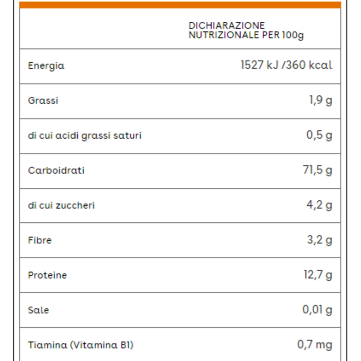 Ingredienti:Semola di grano duro* (69,9%), farina di farro* (30%), tiamina.