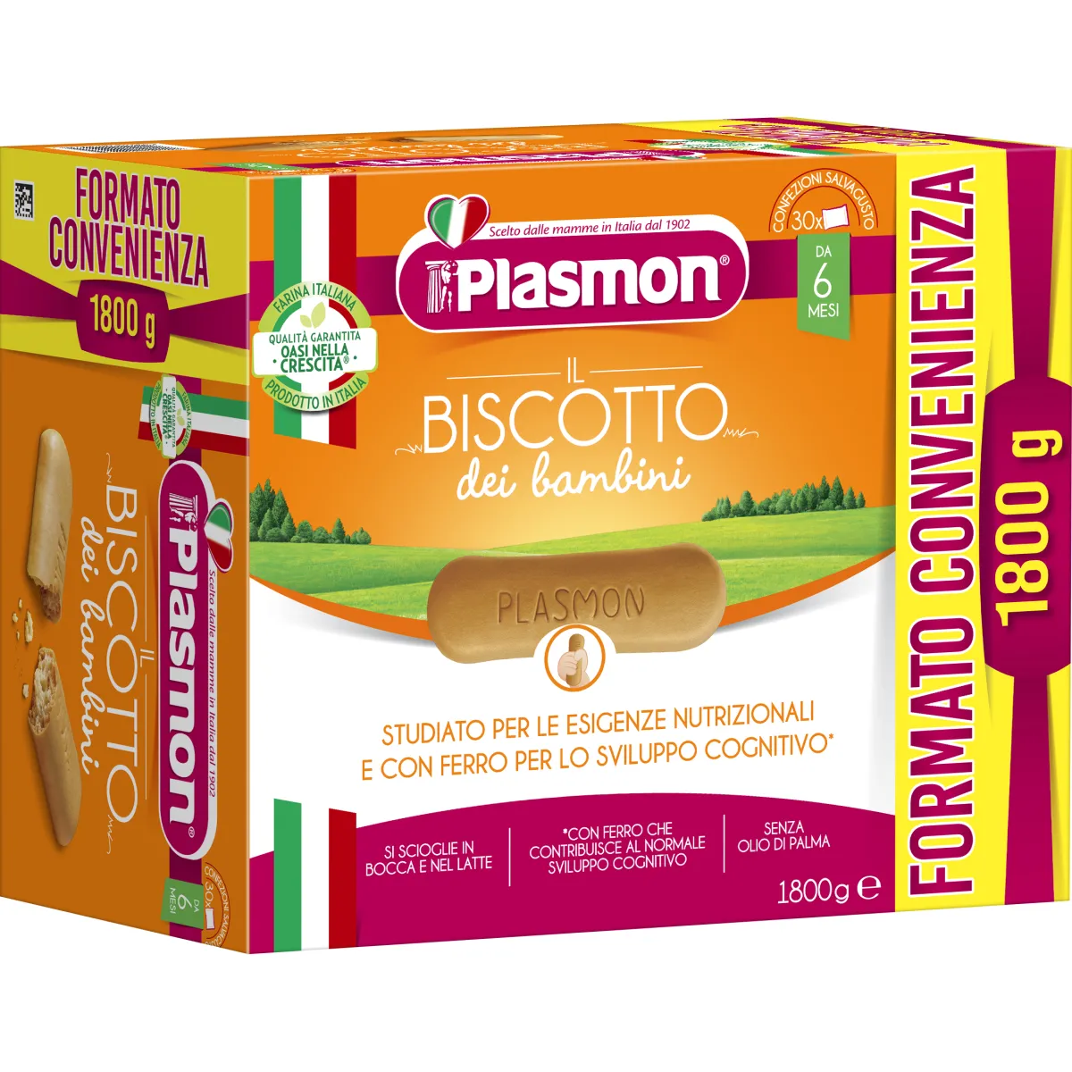L’esclusiva ricetta del Biscotto Plasmon, con calcio, vitamine del gruppo B selezionate e con ferro che contribuisce al normale sviluppo cognitivo e del sistema immunitario.